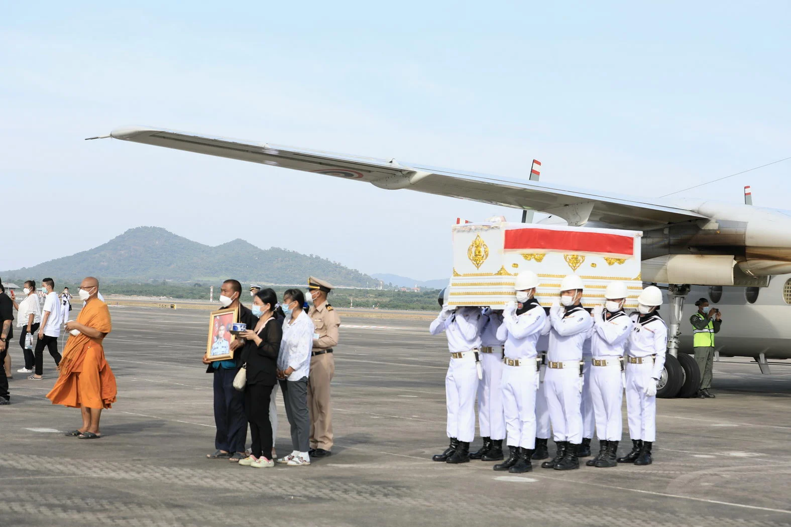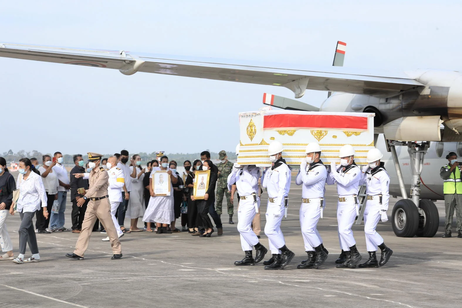 ร่วมเฝ้ารอรับร่าง จ่าตรี ศราวุธ นาดี สังกัด กองเรือฟริเกตที่ 1 กองเรือยุทธการ พลฯ สิทธิพงศ์ หงษ์ทอง พลฯ ลจิราวัฒน์ ธูปหอม และพลฯ วรพงษ์ บุญละคร สังกัด กรมรักษาฝั่งที่ 1 หน่วยบัญชาการต่อสู้อากาศยานและรักษาฝั่ง (กรม รฝ.1 สอ.รฝ) ขึ้นเครื่องบินแบบฟอกเกอร์ กองทัพเรือ เดินทางจาก กองบิน 6 ดอนเมือง กรุงเทพฯ ไปยังปลายทาง สนามบินอู่ตะเภา กองการบินทหารเรือ กองเรือยุทธการ อ.บ้านฉาง จ.ระยอง บรรยากาศเป็นไปด้วยความเศร้าโศกเสียใจ