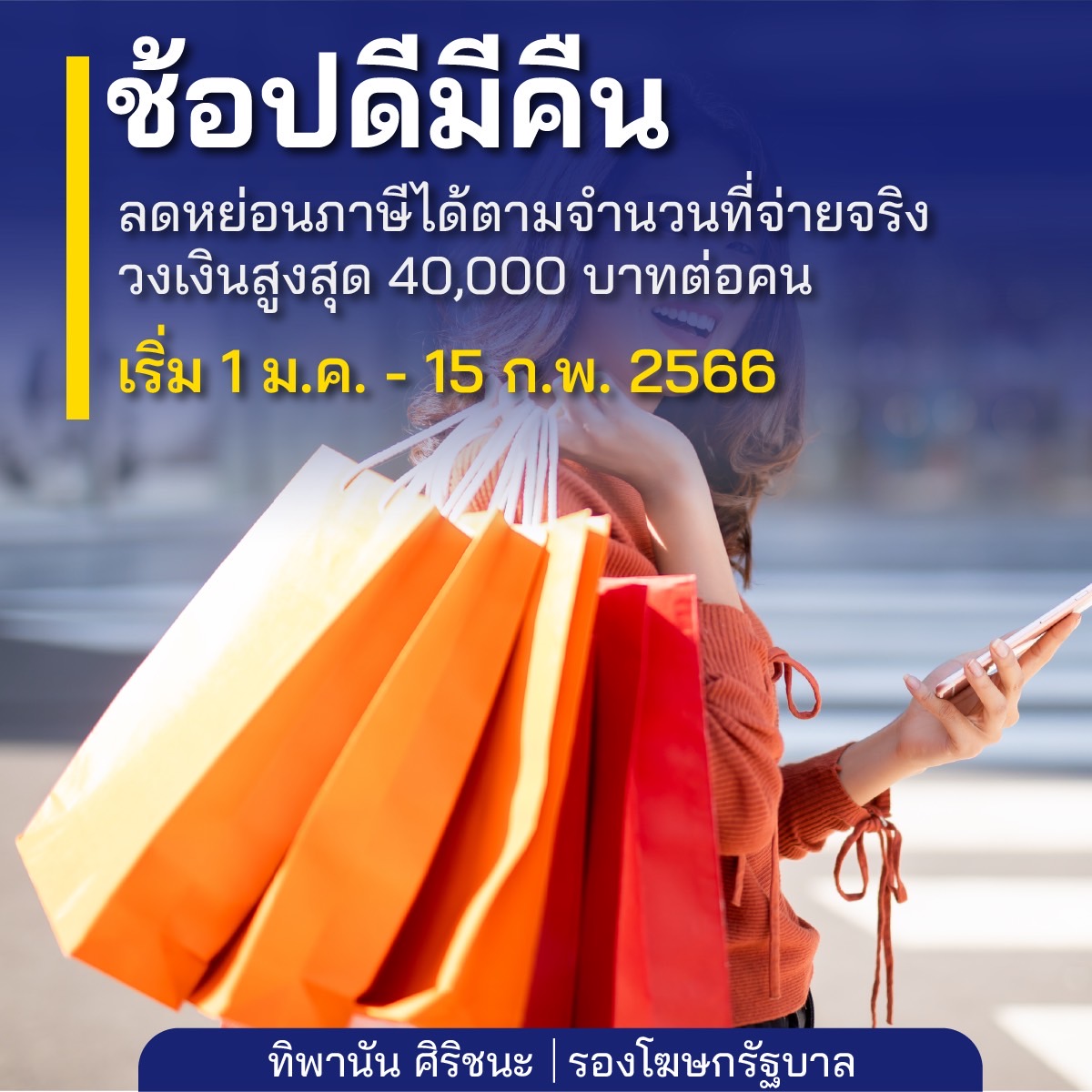 1.มาตรการช้อปดีมีคืน เริ่มตั้งแต่วันที่ 1 มกราคม ถึง 15 กุมภาพันธ์ 2566 โดยกำหนดให้ผู้มีเงินได้ซึ่งมีหน้าที่เสียภาษีเงินได้บุคคลธรรมดา แต่ไม่รวมถึงห้างหุ้นส่วนสามัญหรือคณะบุคคลที่มิใช่นิติบุคคล สามารถหักลดหย่อนค่าซื้อสินค้าหรือค่าบริการตามจำนวนที่จ่ายจริงแต่ไม่เกิน 40,000 บาท