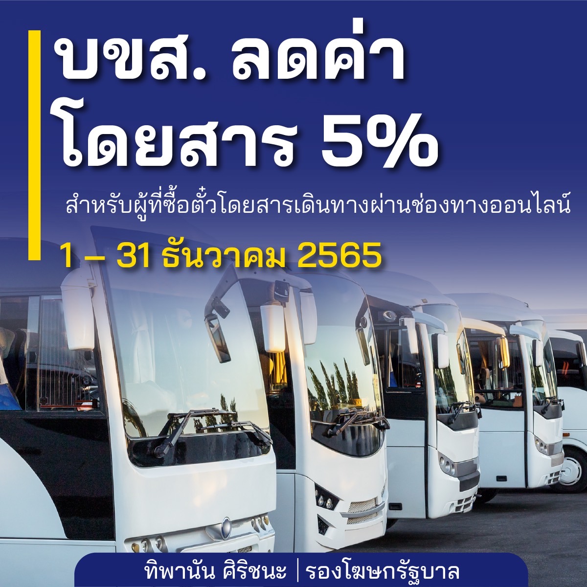 7.มาตรการลดค่าโดยสารของบริษัท ขนส่ง จำกัด (บขส.) ร้อยละ 5 สำหรับผู้ที่ซื้อตั๋วโดยสารเดินทางผ่านช่องทางออนไลน์ วันที่ 1 ถึง 31 ธันวาคม 2565