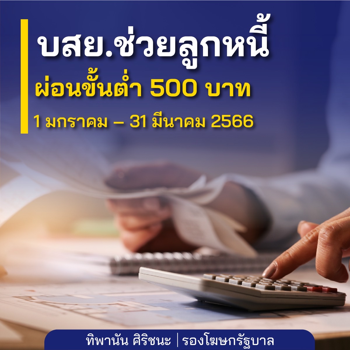 14 .มาตรการช่วยลูกหนี้ สำหรับลูกหนี้ที่เข้าร่วมโครงการปรับโครงสร้างหนี้กับ บสย. ผ่อนน้อย เบาแรง ลดค่างวดผ่อนชำระเหลือ 20% ของค่างวดเดิม ขั้นต่ำ 500 บาทต่องวด สูงสุด 6 งวด ที่ยื่นคำขอระหว่าง 1 มกราคม – 31 มีนาคม 2566