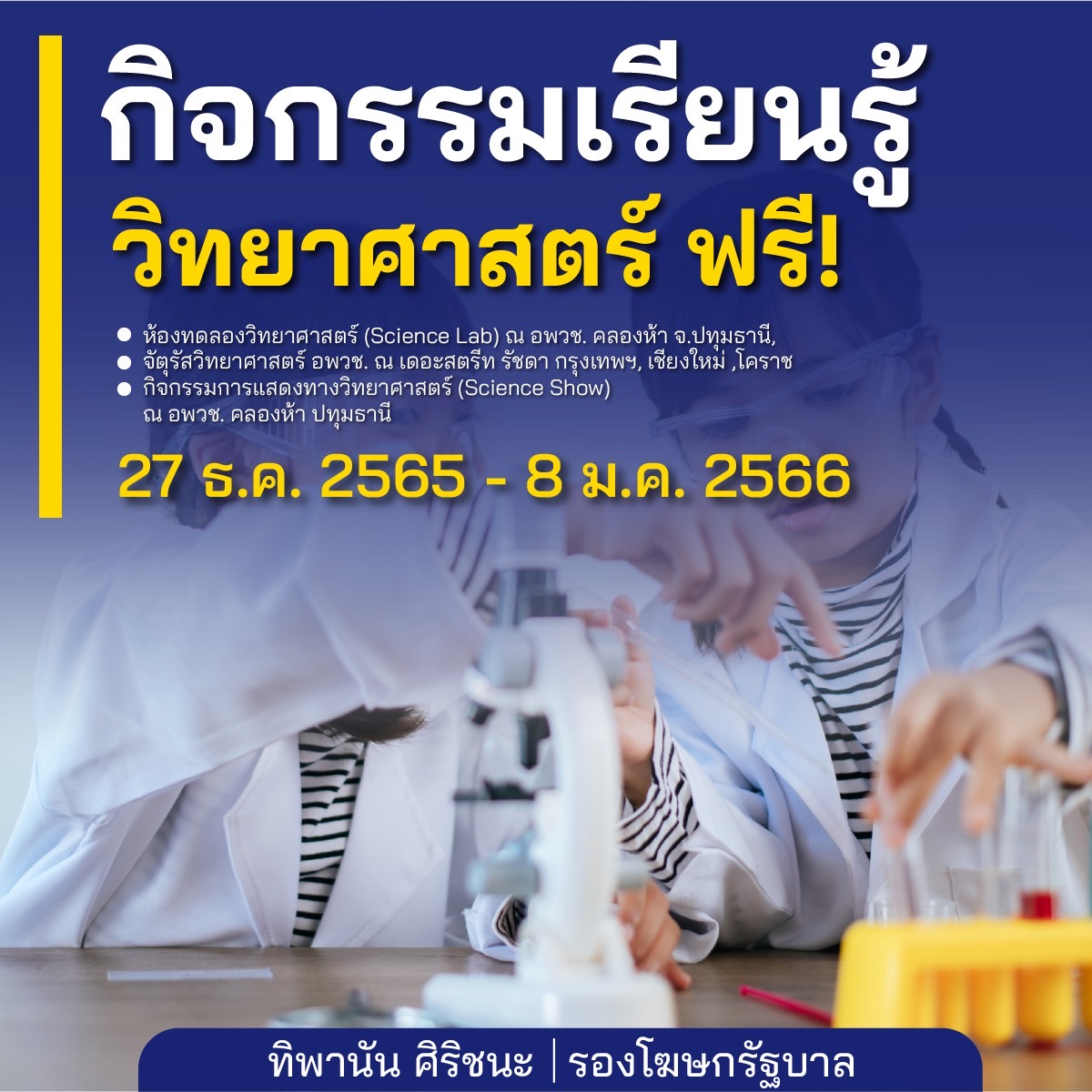 18.กิจกรรมเรียนรู้วิทยาศาสตร์ฟรี 27 ธันวาคม 2565 ถึง 8 มกราคม 2566 เช่น อวพช. คลองห้าปทุมธานี,เดอะสตรีทรัชดากรุงเทพฯ, เชียงใหม่,โคราช