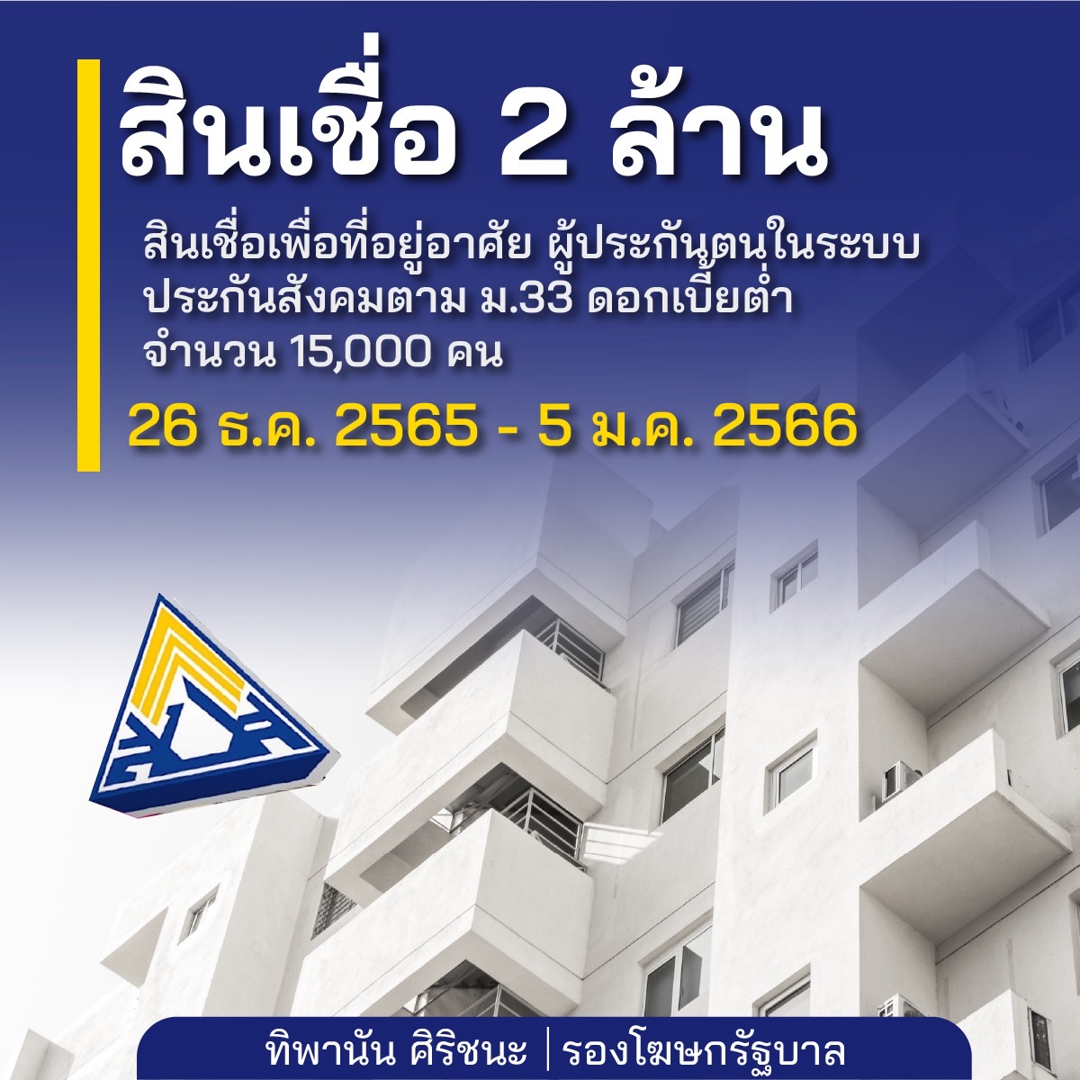 15 .สินเชื่อ 2,000,000 บาทเพื่อที่อยู่อาศัย ผู้ประกันตนระบบประกันสังคมมาตรา 33 ดอกเบี้ยต่ำจำนวน 15,000 คน 26 ธันวาคม 2565 ถึง 5 มกราคม 2566