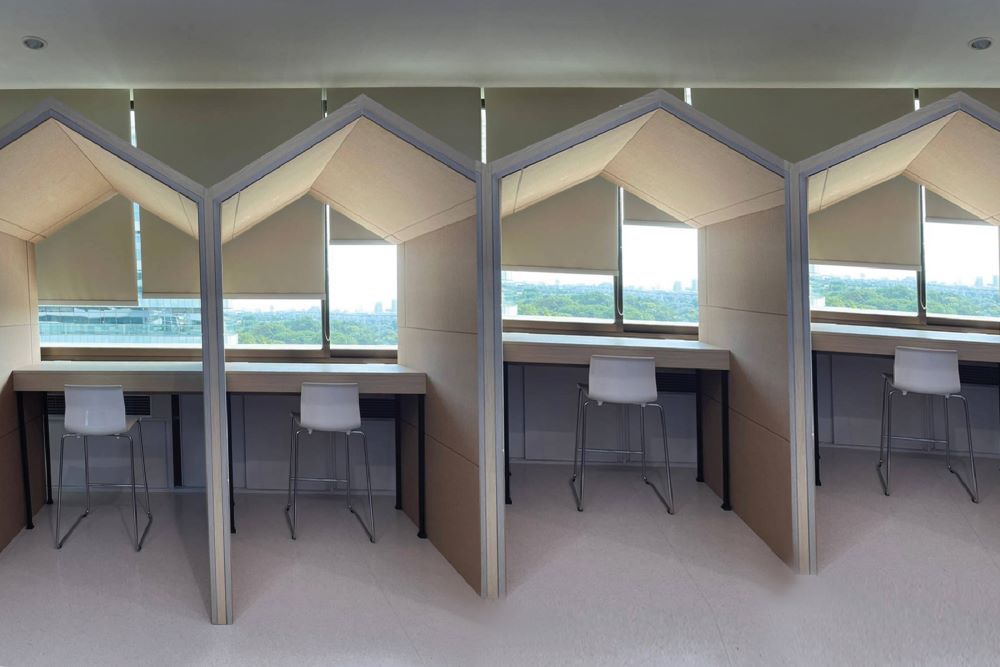 ทั้งในแบบการกั้น Partition ด้วย วัสดุอะคูสติสำหรับผนังดูดซับเสียง.รุ่น Cylence Zandera เพื่อความเป็นส่วนตัวในพื้นที่จำกัด โดยกั้นกำแพงด้านข้าง และเปิดพื้นที่ว่างทั้งด้านหน้าและหลัง โดด้านหนึ่งเปิดให้เห็นวิวภายนอก ด้านในดีไซน์ให้มีโต๊ะทำงานขนาดกะทัดรัด ออกแบบเพื่อการทำงานทั้งแบบออนไลน์ หรือ ประชุมเป็นSmall Group รวมถึงการนำ Acoustic Pod มาเสริมสร้างพื้นที่การทำงานส่วนตัว