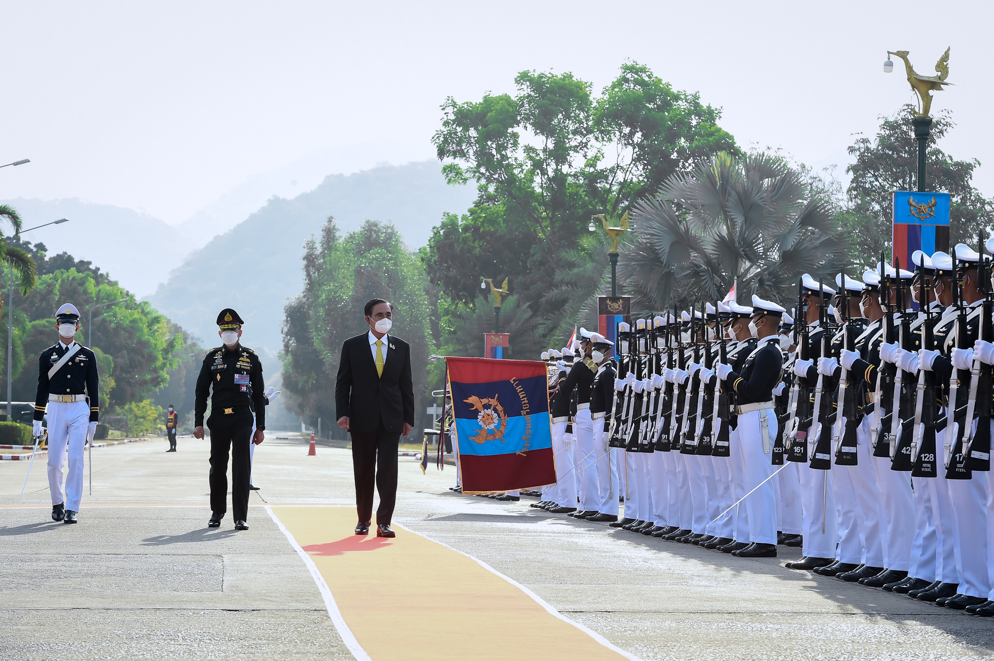 เมื่อนายกรัฐมนตรีเดินทางถึงอาคารกองบัญชาการ โรงเรียนเตรียมทหาร นายกรัฐมนตรียืน ณ แท่นด้านหน้ากองทหารเกียรติยศเพื่อรับการเคารพจากกองทหารเกียรติยศ ดนตรีบรรเลงเพลงมหาฤกษ์ นายกรัฐมนตรีเดินตรวจแถวกองทหารเกียรติยศ แล้วนายกรัฐมนตรีและคณะเข้ารับฟังการบรรยายสรุป ณ ห้องรับรองอัศวิน จากนั้น นายกรัฐมนตรีและคณะ ถวายความเคารพพระบรมราชานุสาวรีย์ รัชกาลที่ 5