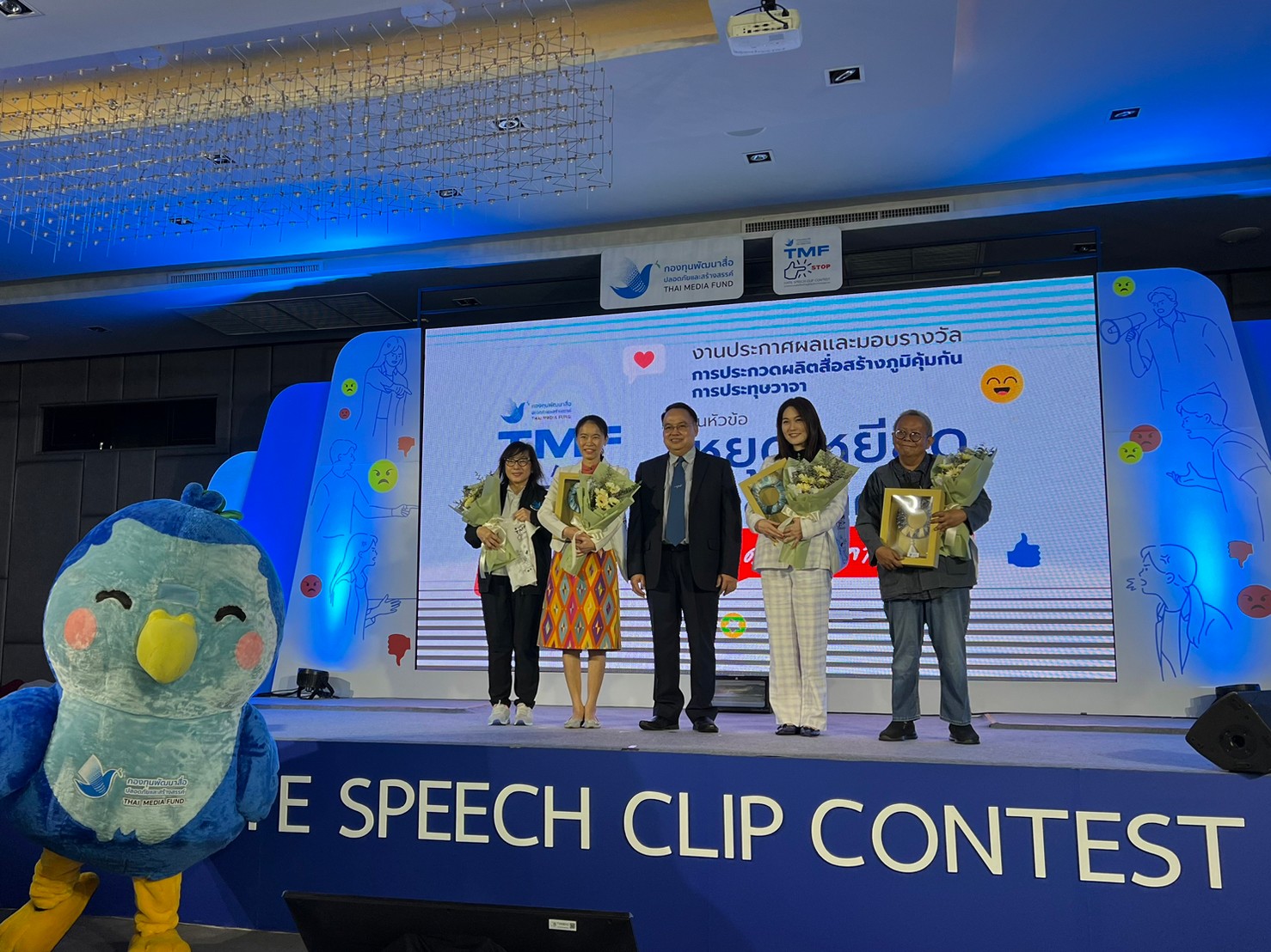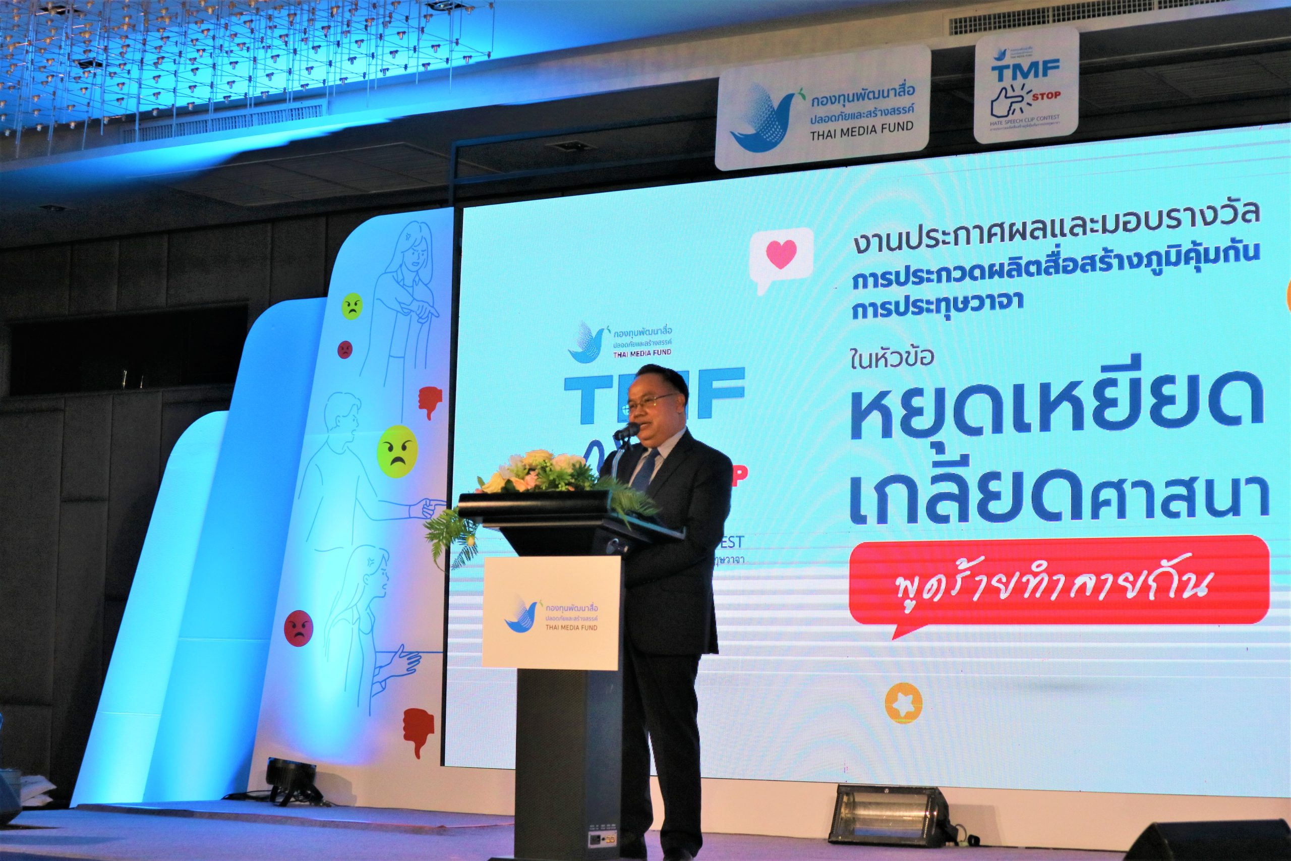 กองทุนพัฒนาสื่อปลอดภัยและสร้างสรรค์ จัดงานประกาศผล และมอบรางวัลการประกวดคลิปรณรงค์โครงการ TMF STOP HATE SPEECH CLIP CONTEST หัวข้อ “หยุดเหยียดเกลียดศาสนา พูดร้ายทำลายกัน” โดยมี ดร.ธนกร ศรีสุขใส ผู้จัดการกองทุนพัฒนาสื่อปลอดภัยและสร้างสรรค์ ให้เกียรติเป็นประธาน พร้อมด้วยผู้ทรงคุณวุฒิ ภายในงานมีการจัดแสดงนิทรรศการผลงานของทั้ง 15 ทีม ที่ผ่านเข้ารอบฝ่าด่านการคัดเลือกมาจากผลงานที่ส่งมาทั่วประเทศ พร้อมชมคลิปรางวัลชนะเลิศจากผลงานผู้ชนะ และร่วมเป็นเกียรติในพิธีมอบรางวัล เมื่อวันอังคารที่ 31 มกราคม 2566 เวลา 09.00 – 12.00 น. ที่โรงแรมเดอ ไพรม์ รางน้ำ