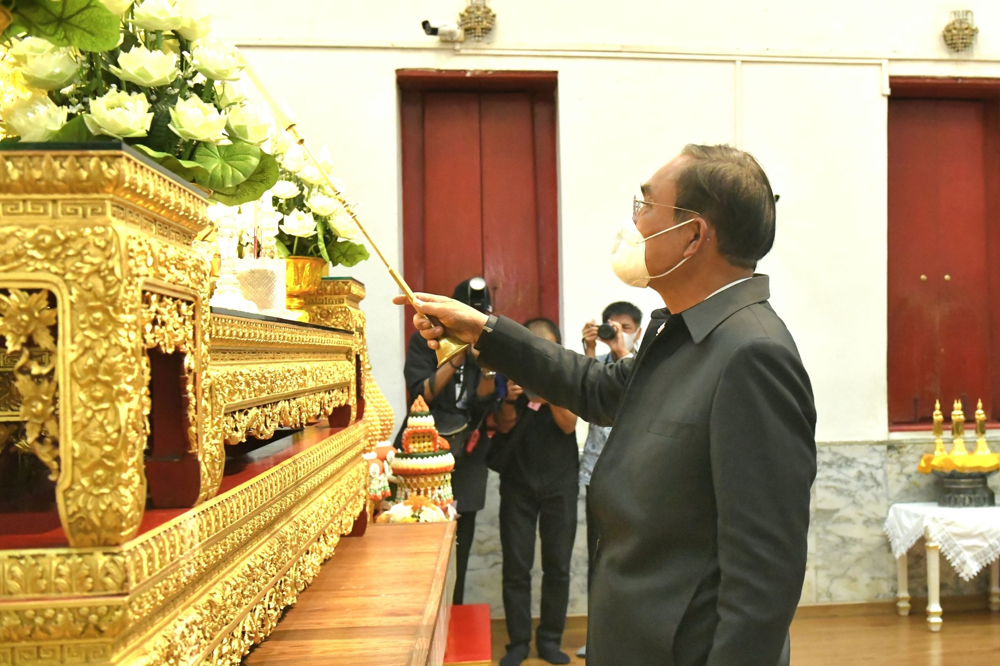จากนั้นนายกรัฐมนตรีและคณะ ได้เดินทางไปยังวัดเพชรสมุทรวรวิหาร เพื่อสักการะหลวงพ่อบ้านแหลม ซึ่งเป็นสิ่งศักดิ์สิทธิ์ของจังหวัดสมุทรสงคราม เพื่อความเป็นสิริมงคล และนมัสการพระสมุทรวชิรโสภณ ที่ปรึกษาเจ้าคณะจังหวัดสมุทรสงคราม และเจ้าอาวาสวัดเพชรสมุทรวรวิหาร ณ พระอุโบสถวัดเพชรสมุทรวรวิหารด้วย