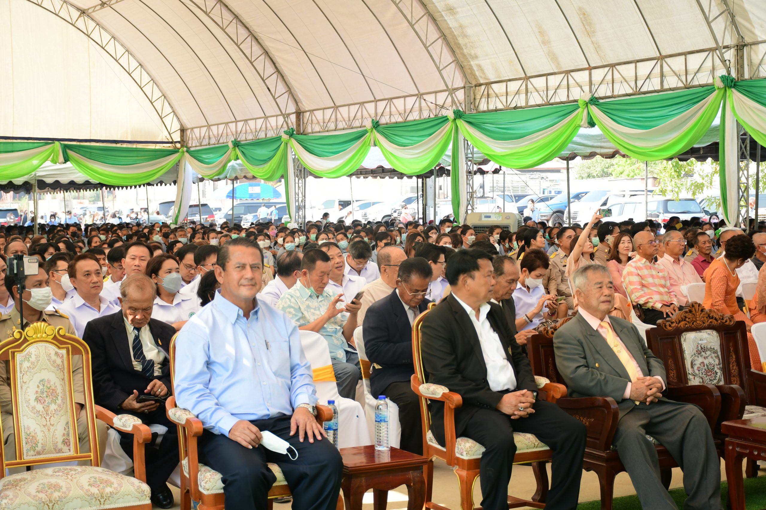 โดยมีนายศักรินทร์ ทุมเสน รองผู้ว่าราชการจังหวัด นายแพทย์โอภาส การย์กวินพงศ์ ปลัดกระทรวงสาธารณสุข นายแพทย์ณรงค์ สายวงษ์ รองปลัดกระทรวงสาธารณสุข แพทย์หญิงอัจฉรา นิธิอภิญญาสกุล รักษาราชการแทนผู้ตรวจราชการกระทรวงสาธารณสุข เขตสุขภาพที่ 5 คณะผู้บริหาร หัวหน้าส่วนราชการ คณะกรรมการพัฒนาโรงพยาบาล อสม.จังหวัดกาญจนบุรี ร่วมงานกว่า 1,500 คน