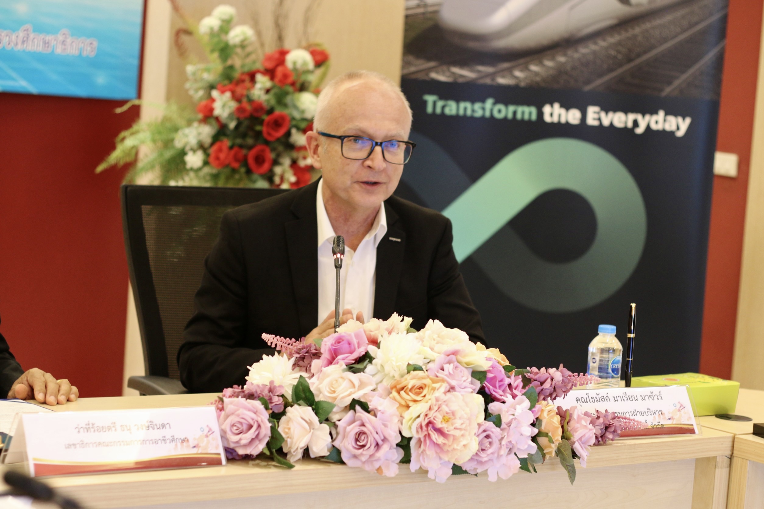 คุณโธมัสค์ กล่าวว่า “ปีนี้ถือเป็นปีที่ 19 ของการจัดทำโครงการการศึกษาทวิภาคีในประเทศไทย และเป็นปีที่ 10 ของการทำงานร่วมกันอย่างต่อเนื่องระหว่าง สำนักงานคณะกรรมการการอาชีวศึกษา กับ บริษัท ซีเมนส์ โมบิลิตี้ จำกัด บันทึกความเข้าใจความฉบับนี้ เราได้ขยายโครงการให้ครอบคลุมวิทยาลัยเทคนิคทุกแห่งในประเทศไทย โดยเป้าหมายของเราทุ่มเทและขยายโอกาสให้กับนักศึกษามากขึ้น และสนับสนุนครอบครัวของนักศึกษาเรื่องค่าใช้จ่ายในการการศึกษา เพราะเราเห็นความสำคัญของความหลากหลาย