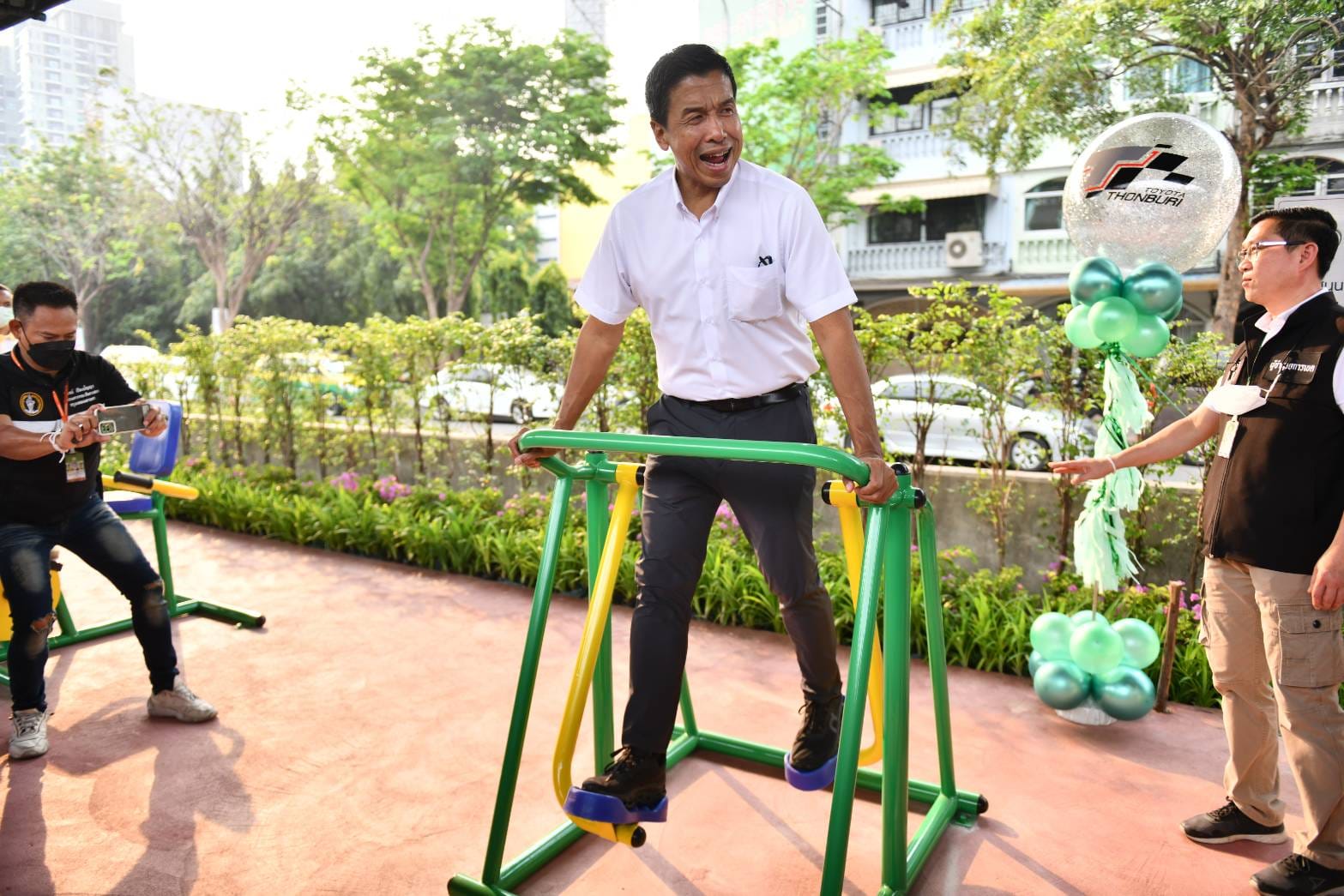 ในการนี้ผู้ว่าราชการกรุงเทพมหานคร รับมอบเครื่องออกกำลังกาย จำนวน 5 เครื่อง จากนายคาร์ล ออพเพนบอร์น กรรมการผู้จัดการ บริษัท โตโยต้า จำกัด เพื่อนำมาใช้งานเป็นสาธารณประโยชน์ในสวน 15 นาที
