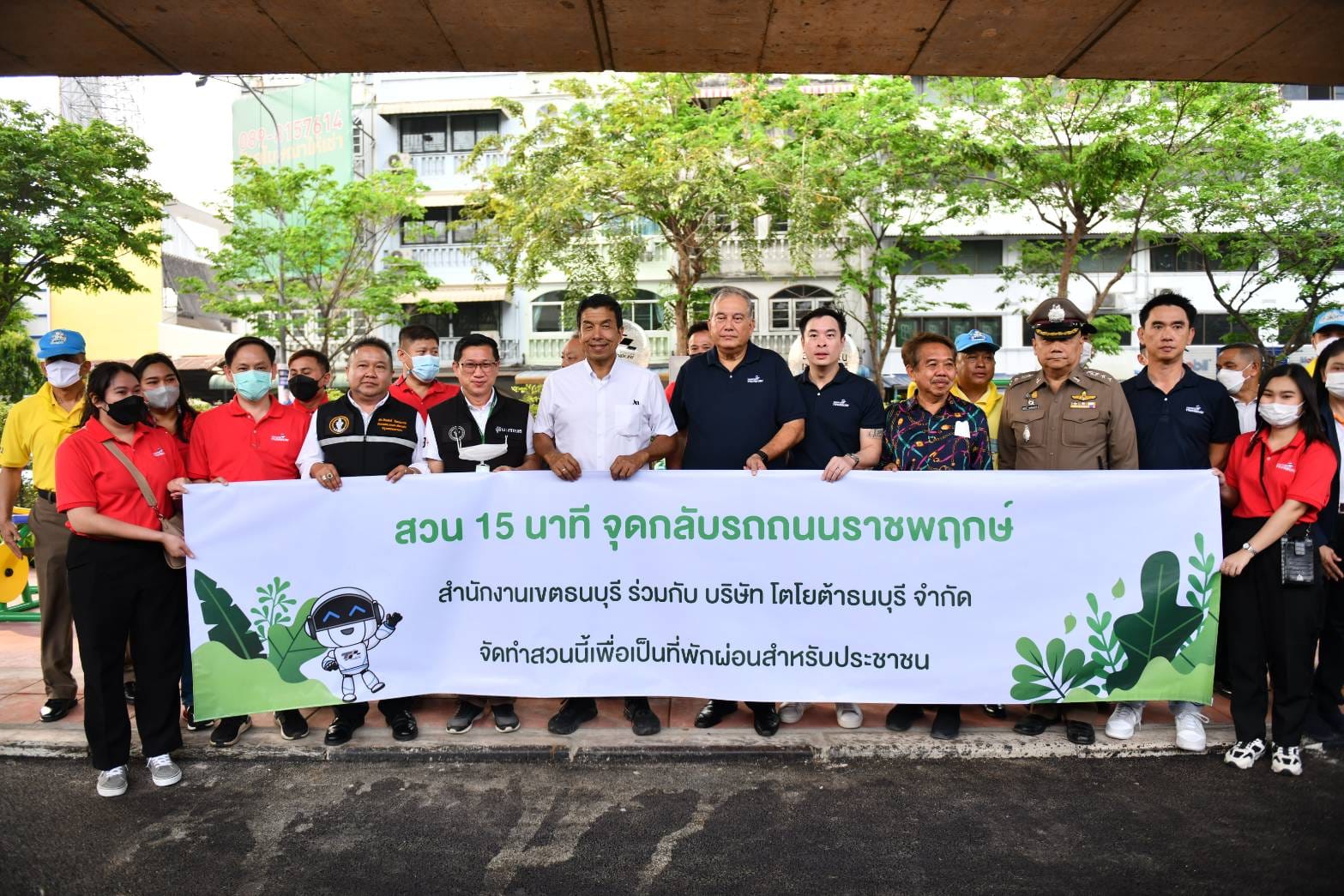 เพื่อร่วมปลูกต้นไม้ 1 ล้านต้น สร้างกำแพงสีเขียวเพื่อกรองฝุ่นทั่วเมือง และพัฒนาปรับปรุงภูมิทัศน์สวน 15 นาที เพิ่มพื้นที่สีเขียวและพื้นที่สาธารณะใกล้บ้านให้คนกรุงเทพฯ ตามนโยบายของผู้ว่าราชการกรุงเทพมหานคร ณ สวน 15 นาที บริเวณใต้สะพานข้ามแยกตากสิน – สาทร ถนนกรุงธนบุรี เขตธนบุรี