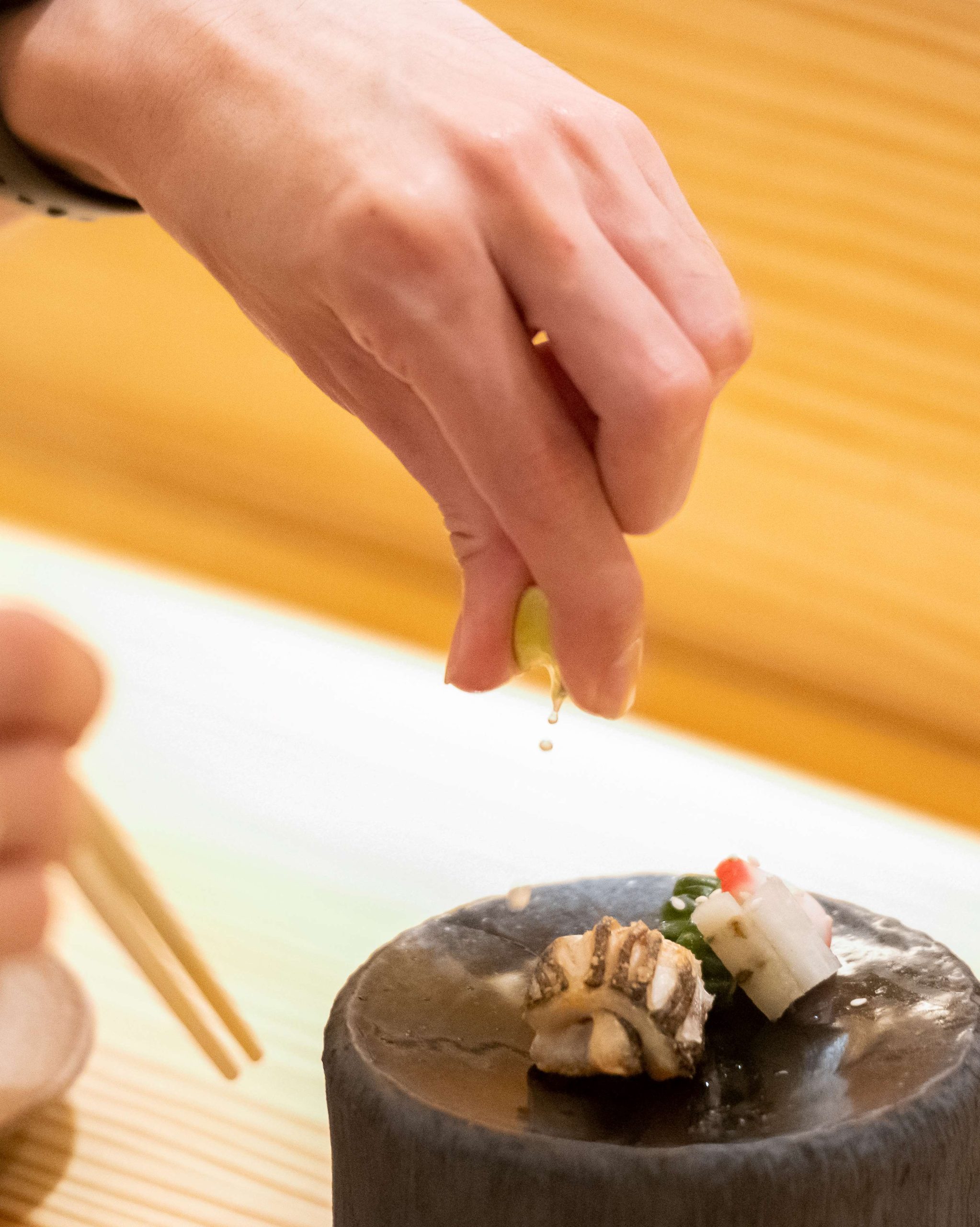 สำหรับเมนูไฮไลท์ในคอร์สที่เสิร์ฟ ได้แก่ White Fujisan Salmon ทีเด็ดอยู่ที่การเสิร์ฟแซลมอน เนื้อสีขาวอายุ 1 ปี ที่เลี้ยงในแหล่งน้ำแร่ธรรมชาติของภูเขาไฟฟูจิ จากจังหวัดชิซูโอกะ ที่มีอุณหภูมิ 11 องศาตลอดทั้งปี จึงให้รสชาติอ่อนโยนและเบา แต่แน่นไปด้วยรสชาติที่หรูหรา และมีไขมันส่วนเกิน เล็กน้อย Ama ebi กุ้งหวานญี่ปุ่นจากฮอกไกโด มีเนื้อสัมผัสเด้งสู้ฟันและให้รสหอมหวานในคำเดียว โดยรสหวานละมุนมาจากตัวกุ้ง ส่วนความหอมหวานมาจากผิวส้มยุสุ Hotate Isobe Yaki