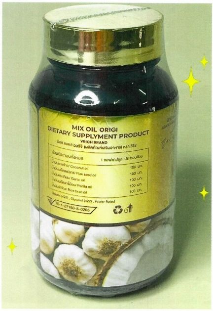 1. มิกซ์ออยล์ ออริจิ ผลิตภัณฑ์เสริมอาหาร (ตรา วีริช) เลขสารบบอาหาร 70-1-27160-5-0205 ระบุสรรพคุณ “…ควบคุมระดับน้ำตาลและคอเลสเตอรอล…ต่อต้านอนุมูลอิสระ…บรรเทาอาการวัยทองทั้งปวง บำรุงสายตา กระดูก เล็บ และเส้นผม บำรุงประสาทและสมอง ช่วยให้หลับสบายยิ่งขึ้น…”