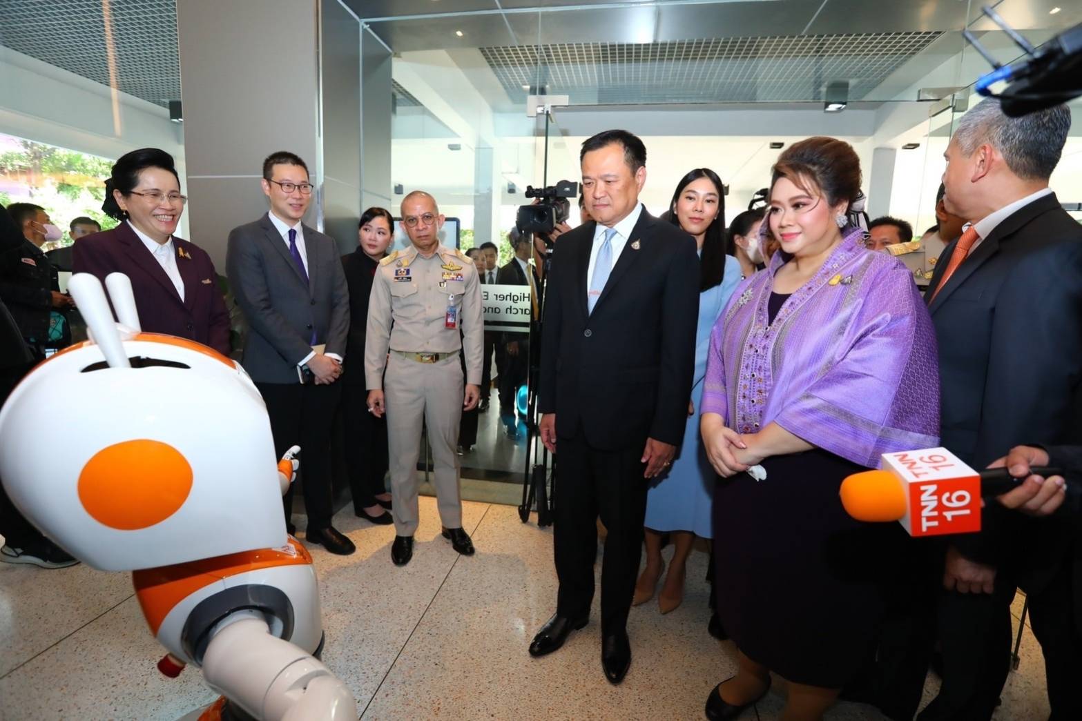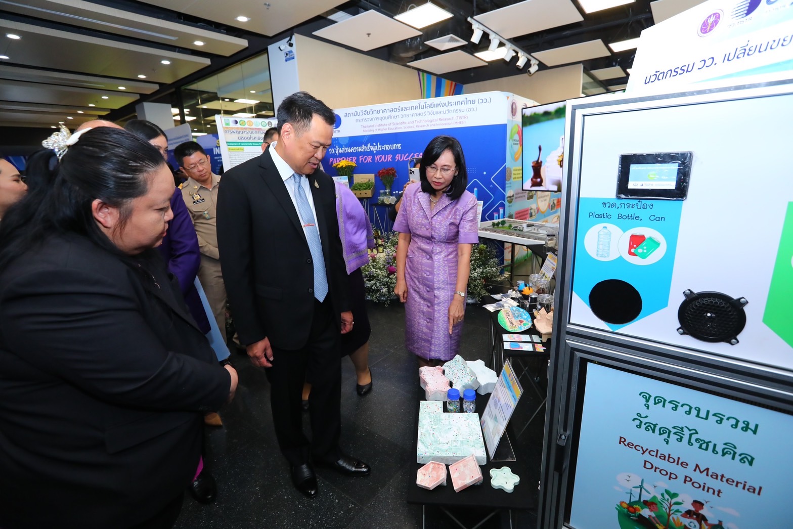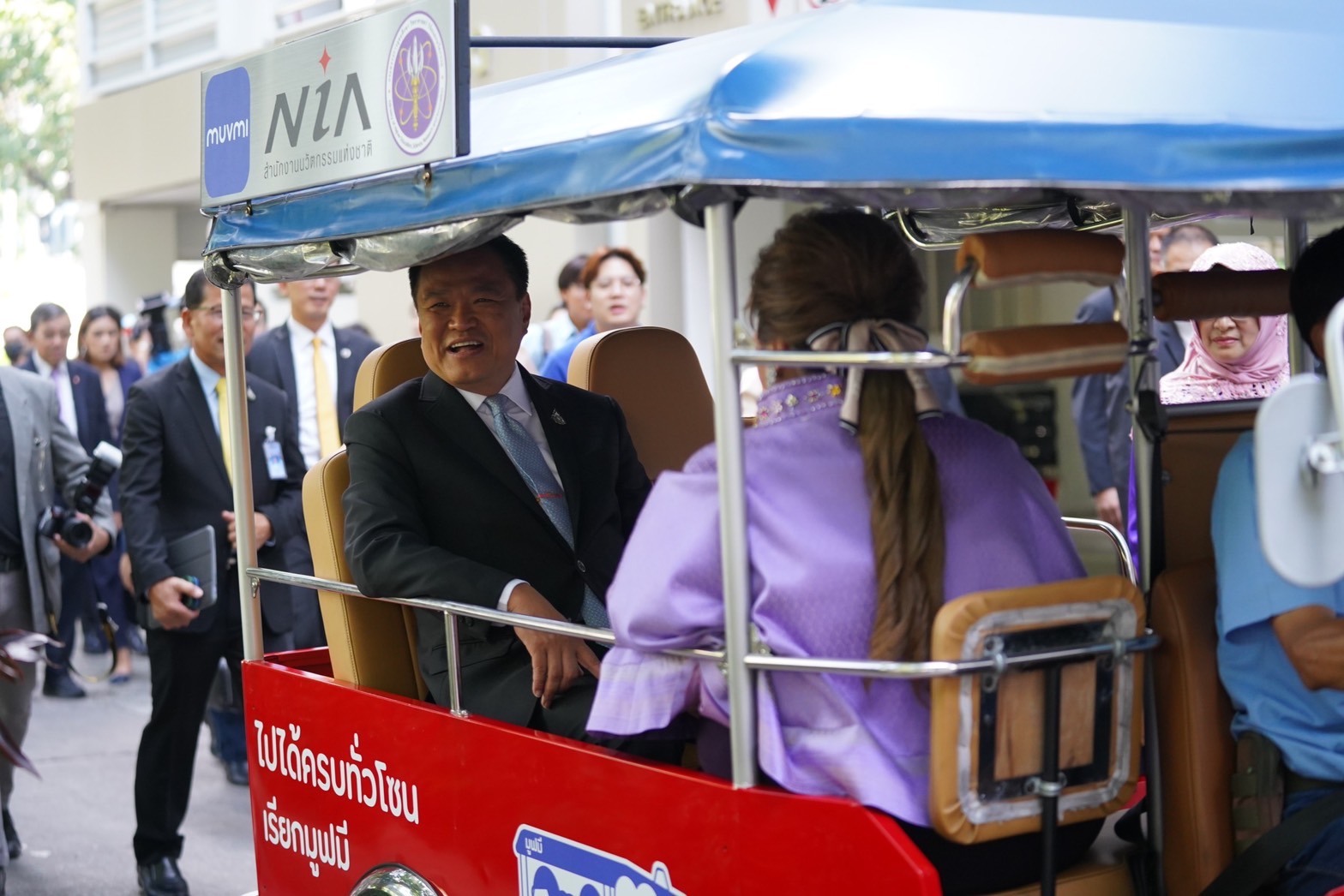 จากนั้นขึ้นรถตุ๊กตุ๊ก ไฟฟ้า EV ( MuvMi) ที่ผลิตโดยคนไทยเพื่อแก้ปัญหาฝุ่น PM 2.5 และลดการใช้พลังงานน้ำมันที่กระทรวง อว.ให้การสนับสนุนภาคเอกชนเพื่อมาชมนิทรรศการการจัดแสดงผลงานเด่นของหน่วยงานต่างๆ ของกระทรวง อว. ก่อนมอบนโยบายให้กับผู้บริหารกระทรวง อว.