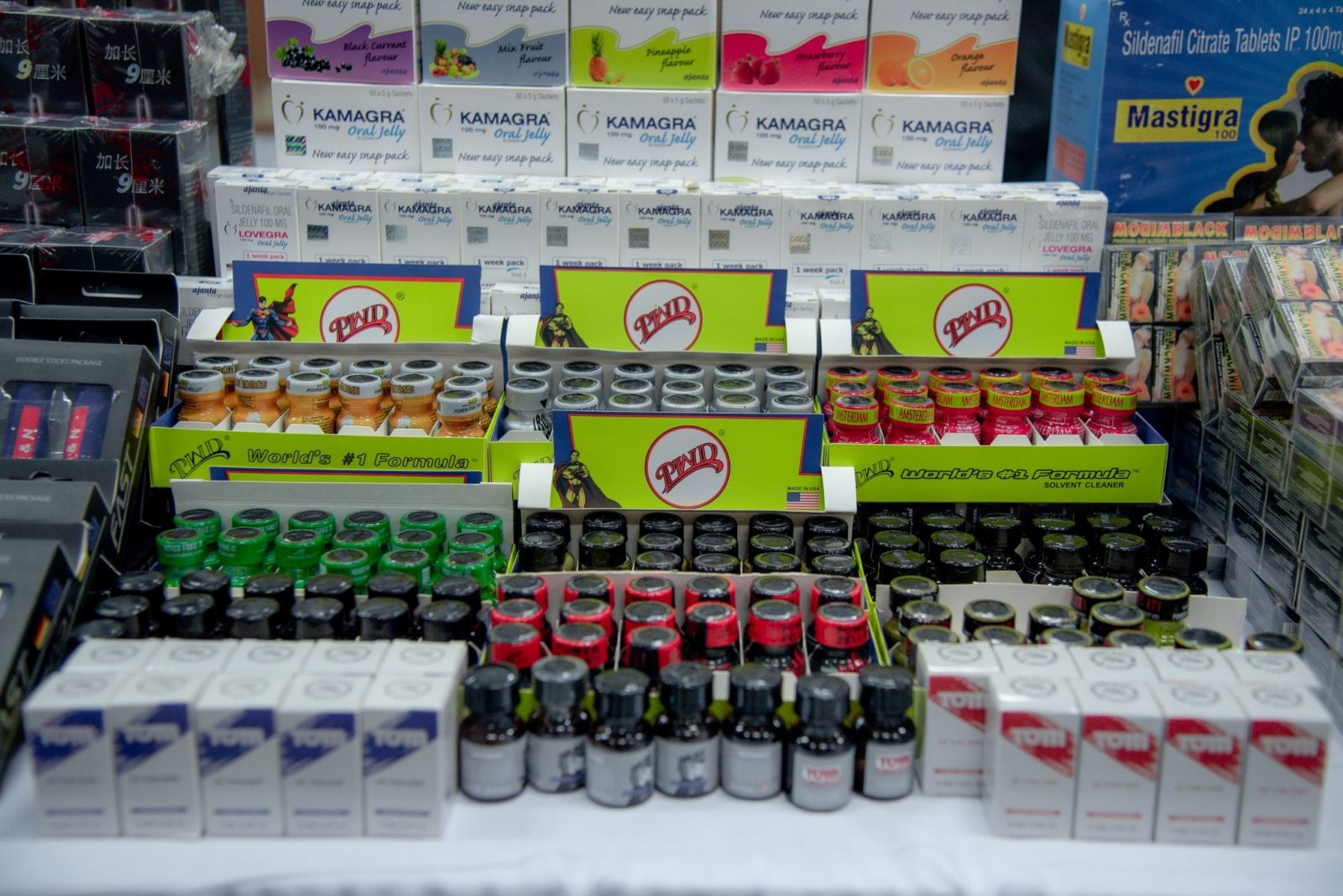 ตรวจยึดของกลางรวม 80 รายการ โดยเป็นยาปลุกเซ็กส์ หรือยาเสียสาว จำนวน 106 ชิ้น, ยาเสริมสมรรถภาพทางเพศ จำนวน 1,891 ชิ้น , ผลิตภัณฑ์สำหรับทากระตุ้นความรู้สึกทางเพศ จำนวน 169 ชิ้น, ผลิตภัณฑ์ต้องสงสัยว่าเป็นยาเสพติดประเภทสารระเหย ( ป็อปเปอร์ ) จำนวน 220 ขวด, เซ็กส์ทอยรูปแบบต่างๆ และถุงยางอนามัย จำนวน 470 ชิ้น