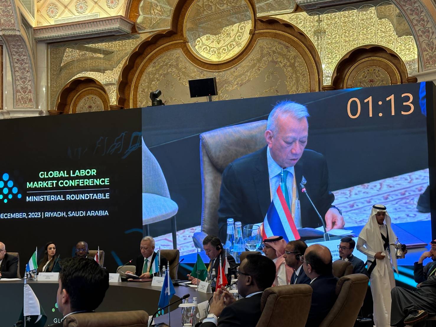13 ธันวาคม 2566 เวลา 09.00 น. ตามเวลาท้องถิ่นของประเทศซาอุดีอาระเบีย ซึ่งช้ากว่าประเทศไทย 4 ชั่วโมง นายพิพัฒน์ รัชกิจประการ รัฐมนตรีว่าการกระทรวงแรงงาน พร้อมด้วย นายไพโรจน์ โชติกเสถียร ปลัดกระทรวงแรงงาน นางสาวบุปผา เรืองสุด อธิบดีกรมพัฒนาฝีมือแรงงาน และ นายสมชาย มรกตศรีวรรณ ผู้ตรวจราชการกระทรวงแรงงาน รักษาราชการแทน อธิบดีกรมการจัดหางาน