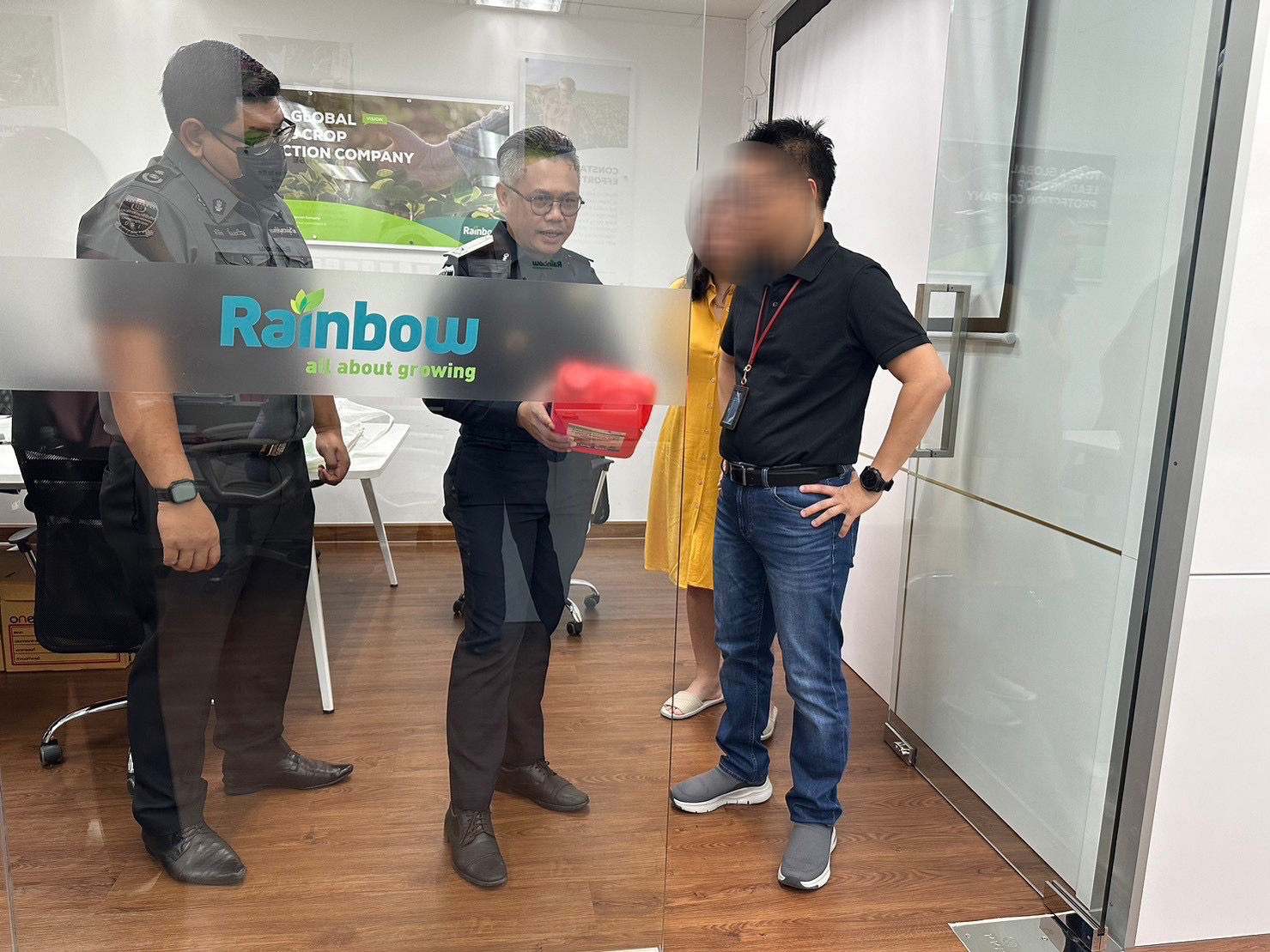 โดยเมื่อวันอังคารที่ 19 ธันวาคม 2566 คณะพนักงานสอบสวนคดีพิเศษได้สนธิกำลังกับเจ้าหน้าที่ กรมวิชาการเกษตร เข้าตรวจค้น บริษัท เรนโบว์ฯ ตั้งอยู่ที่เขตวังทองหลาง กรุงเทพ และ บริษัท อโกร ไอริส (ประเทศไทย) จำกัด ตั้งอยู่ที่เขตยานนาวา กรุงเทพฯ