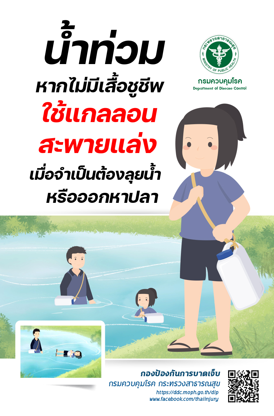 และ 5. หากต้องโดยสารเรือหรือเดินทางทางน้ำ ต้องสวมเสื้อชูชีพทุกครั้ง กรณีถ้าไม่มีให้ใช้อุปกรณ์ที่ลอยน้ำได้ เช่น ถังแกลลอนพลาสติกเปล่าปิดฝาผูกเชือก ขนาด 5 ลิตร สะพายแล่งแทน