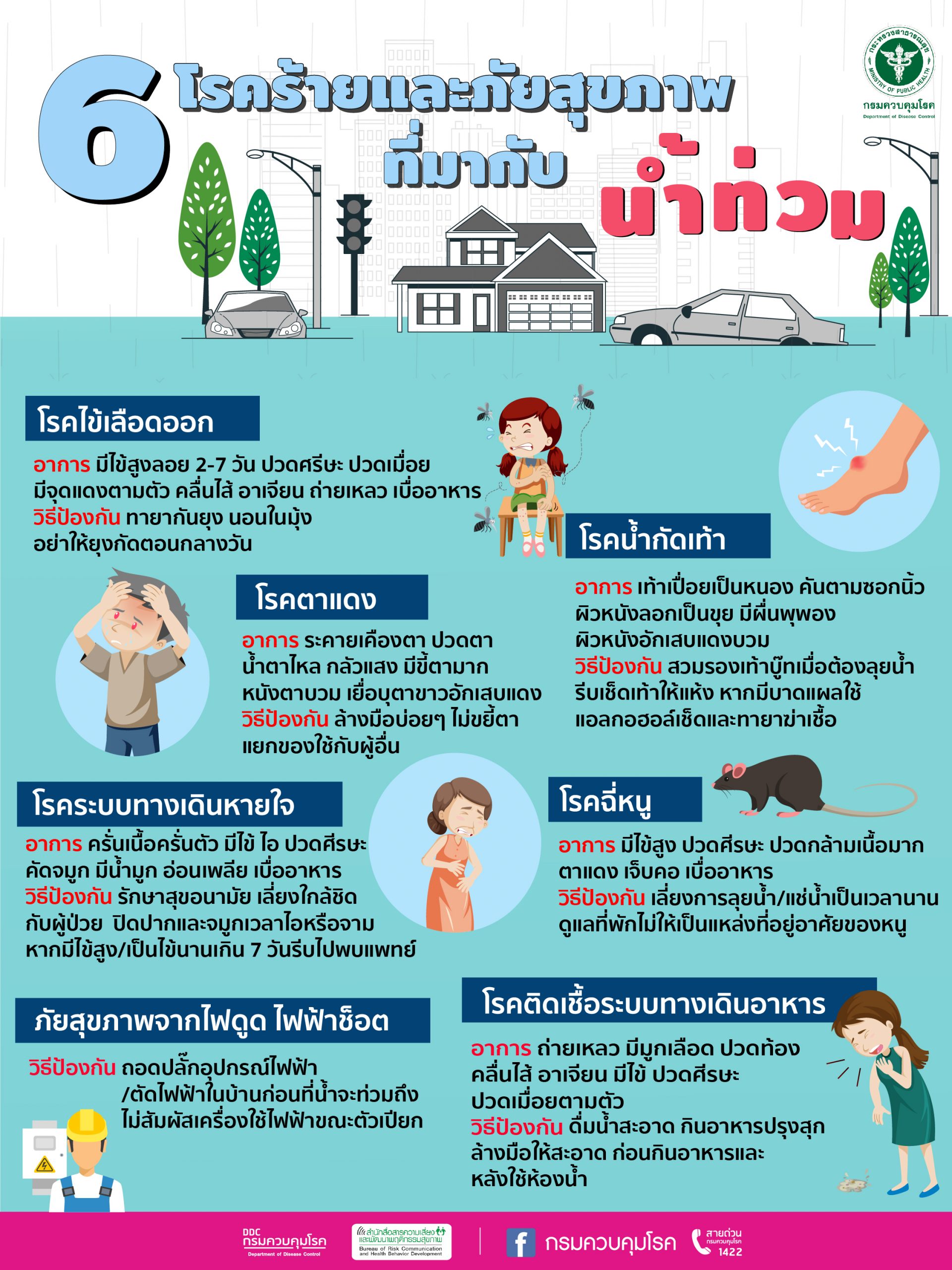 กรมควบคุมโรค มีความห่วงใยประชาชนในพื้นที่ที่ได้รับผลกระทบ จึงขอให้ประชาชนที่อยู่ในพื้นที่น้ำท่วม ระมัดระวัง ติดตามข่าวสารจากทางราชการ และเตรียมความพร้อมอยู่เสมอ สำหรับโรคและภัยสุขภาพที่ต้องระมัดระวังในช่วงน้ำท่วม มีดังนี้