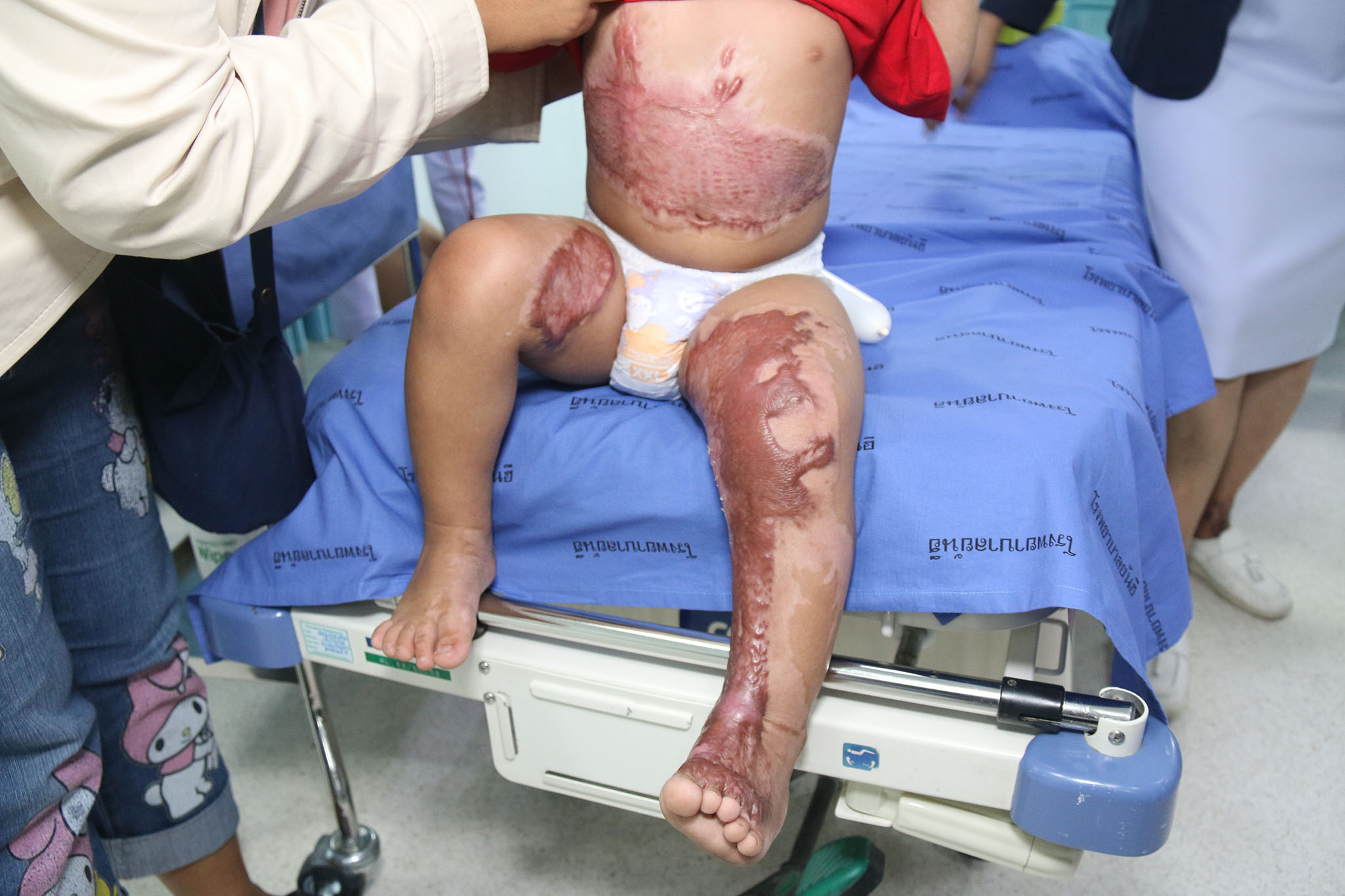 ทางด้าน นายแพทย์พินัย จิรฐิติวงศ์ แพทย์ผู้ชำนาญการด้านศัลยกรรมตกแต่ง ศูนย์ศัลยกรรมตกแต่ง โรงพยาบาลยันฮี กล่าวว่า ผู้ป่วยเด็กรายนี้มีประวัติ ถูกน้ำมันเดือดราดทั่วตัวมาประมาณ 5 ถึง 6 เดือนแล้ว จากการประเมินพบเป็นแผลน้ำมันลวกในระดับที่สอง ซึ่งมีโอกาสที่จะเกิดปัญหาได้ในอนาคต ปัจจุบันเริ่มมีแผลเป็นนูนบริเวณขาซ้ายและมือทั้งสองข้าง”