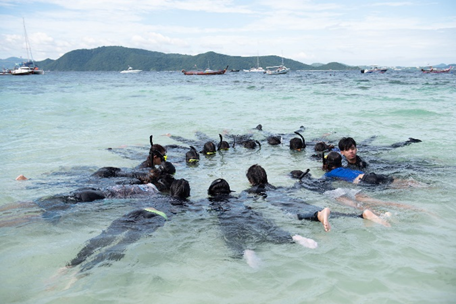 กระแสน้ำที่พัดเข้าหาปะการังหลากสีสันใต้ผืนน้ำของเกาะเฮ จังหวัดภูเก็ต ได้พัดพาความตื่นตาตื่นใจให้เยาวชนกว่า 20 ชีวิตได้เก็บความทรงจำสุดประทับใจในค่ายไปพร้อมกัน โดยการดำน้ำสำรวจแนวปะการังถือเป็นอีกหนึ่งกิจกรรมไฮไลท์ของค่ายในครั้งนี้ นางสาวปิยพร รัตนวัลย์ หรือน้องการ์ตูน นักศึกษาชั้นปีที่ 1 จากคณะประมง มหาวิทยาลัยเกษตรศาสตร์ ได้เล่าด้วยนำเสียงตื่นเต้นว่า “ค่ายนี้ทำให้หนูได้มีโอกาสลองดำน้ำเป็นครั้งแรก ซึ่งความจริงก่อนจะมาค่ายนี้ หนูยังลังเลว่าชอบสายนี้จริงไหม แต่วินาทีที่ได้ดำน้ำลงไปเห็นปะการัง ทำให้หนูเห็นตัวเองชัดเจนมากว่าจะไปต่อทางสายวิทยาศาสตร์ทางทะเลแน่ๆ ค่ะ เพราะถึงแม้อาจจะลำบากเล็กน้อยตอนลงภาคสนาม แต่เราอยู่ตรงนี้ได้แบบไม่เหนื่อยเลยเพราะรักจริงๆ นอกจากนี้ ตอนที่ค่ายพาไปดูศูนย์ช่วยเหลือเต่าทะเล ด้วยความที่ชอบเต่าทะเลอยู่แล้ว และตอนทำสัมมนาหนูก็ทำหัวข้อ “เต่าเล็กควรออกจากฝั่ง” ก็ทำให้ประทับใจขึ้นไปอีก หลังจากกลับค่ายมาคือเห็นเส้นทางตัวเองชัดว่าอยากจะเรียนต่อสายนี้เพื่อเป็นอีกมือที่จะช่วยให้ท้องทะเลสดใสขึ้นค่ะ”