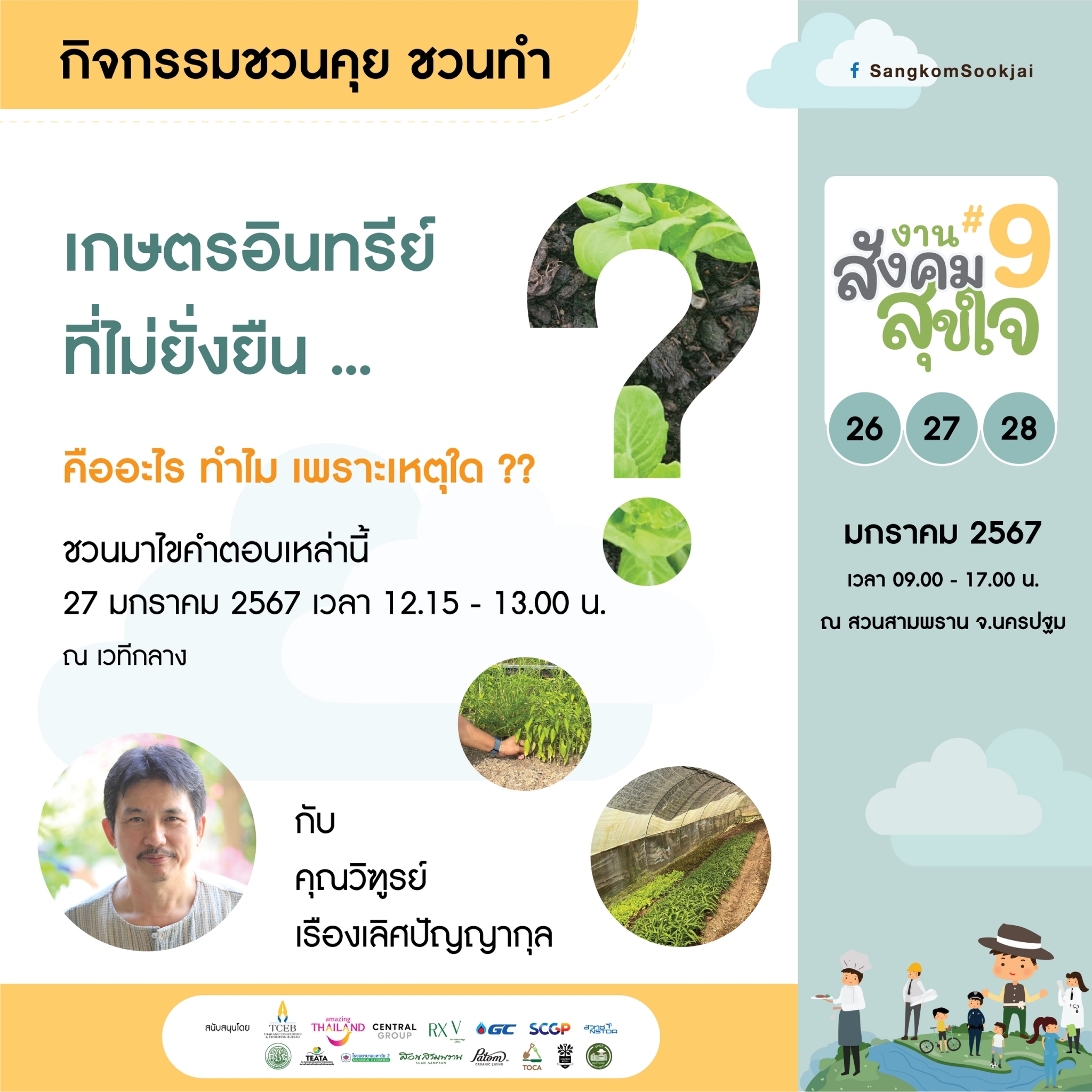 หนึ่งปีมีครั้งเดียวเท่านั้น!! ไม่ควรพลาดกับ งานสังคมสุขใจครั้งที่ 9 “รวมพลังขับเคลื่อนสังคมอินทรีย์” โดยมูลนิธิสังคมสุขใจร่วมกับ สำนักงานส่งเสริมการจัดประชุมและนิทรรศการ (องค์การมหาชน) (สสปน.) การท่องเที่ยวแห่งประเทศไทย (ททท.) และภาคีเครือข่าย ร่วมกันจัดขึ้นอีกครั้งอย่างยิ่งใหญ่ เอาใจสายสุขภาพ สายเที่ยวรักษ์โลก ในงานเตรียมพบกับ ความรู้ เวิร์คช็อป เครือข่าย และสินค้าเกษตรอินทรีย์จากเกษตร ทั่วประเทศ นับ 1,000 รายการ ขนมาให้ช้อปกันจุใจ รวมถึง กิจกรรมดีๆ อีกมากมาย งานเดียวเที่ยวได้ทั้งครอบครัว 26-28 มกราคมนี้ ณ สวนสามพราน จ.นครปฐม เช้างานฟรี!!