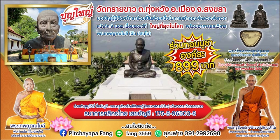 บริจาค ๘๙๙ บาทต่อ ๑ องค์ ที่วัดทรายขาว เพื่อสร้างวิหารบรรจุสรีระหลวงพ่อผัน จะไปรับเอง หรือให้วัดจัดส่งก็ได้ ทั่วประเทศ