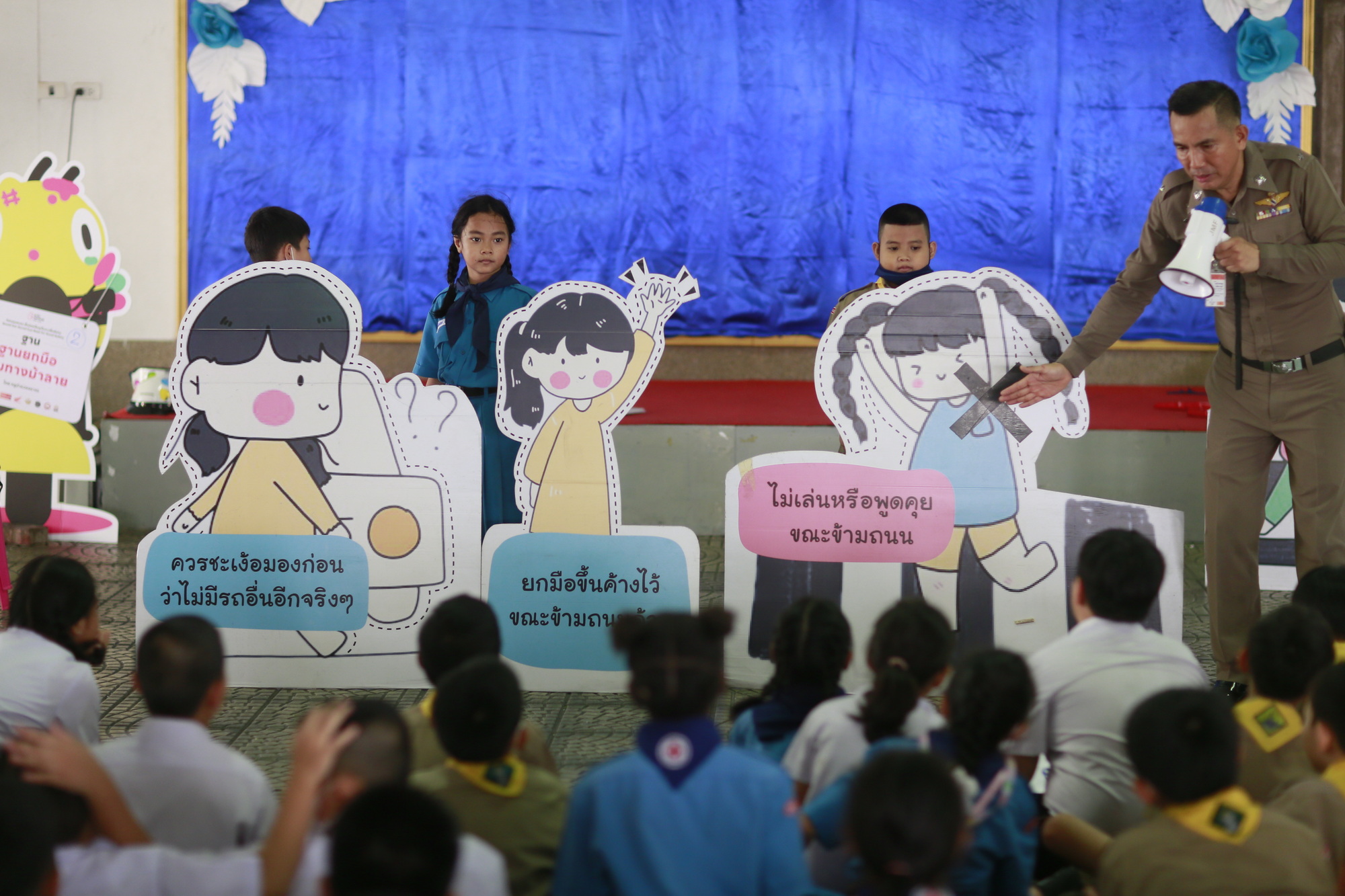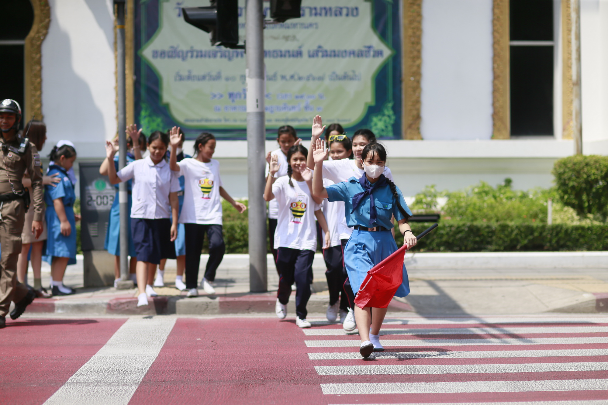 และที่ได้รับความสนใจ และถือเป็นเรื่องใกล้ตัวมากๆ คือ กิจกรรมยกมือข้ามทางม้าลาย เพื่อความปลอดภัยของคนข้ามถนน ซึ่งครูตำรวจจราจรกลาง นำโดย พ.ต.อ.หญิง จินดา กลับกลาย ที่ปรึกษาด้านกฎหมายจราจร ศูนย์บริหารงานจราจร สำนักงานตำรวจแห่งชาติ ร.ต.ต.เฉลิมพรหม อิทธิยาภรณ์ กองบังคับการตำรวจราจร เจ้าหน้าที่ตำรวจสถานีตำรวจยานนาวา และเจ้าหน้าที่เทศกิจ สำนักงานเขตสาทร ร่วมกันจัดกิจกรรมนี้ให้เยาวชนอย่างเต็มที่ ทั้งสาธิตการข้ามทางม้าลายอย่างปลอดภัย และพาน้องๆ ไปฝึกข้ามทางม้าลาย บริเวณหน้าโรงเรียนจริง ที่ต้องคอยชะเง้อดูรถ ไม่เล่น ไม่คุย เวลาข้ามถนนให้ยกมือขึ้นสูงๆ ถ้ามากับผู้ใหญ่ให้ผู้ใหญ่จูง ในการฝึกอบรมครั้งนี้น้องๆ ยังมีโอกาส ร่วมกันระดมสมอง และร่วมออกแบบ ให้ถนนเมืองไทยปลอดภัย ซึ่งส่วนใหญ่สะท้อนว่า อยากให้ผู้ใหญ่ไม่ขับรถเร็วเกินไป และอยากให้ผู้ใหญ่หยุดรถให้เด็กข้ามถนน