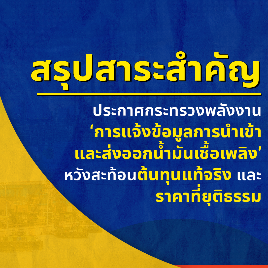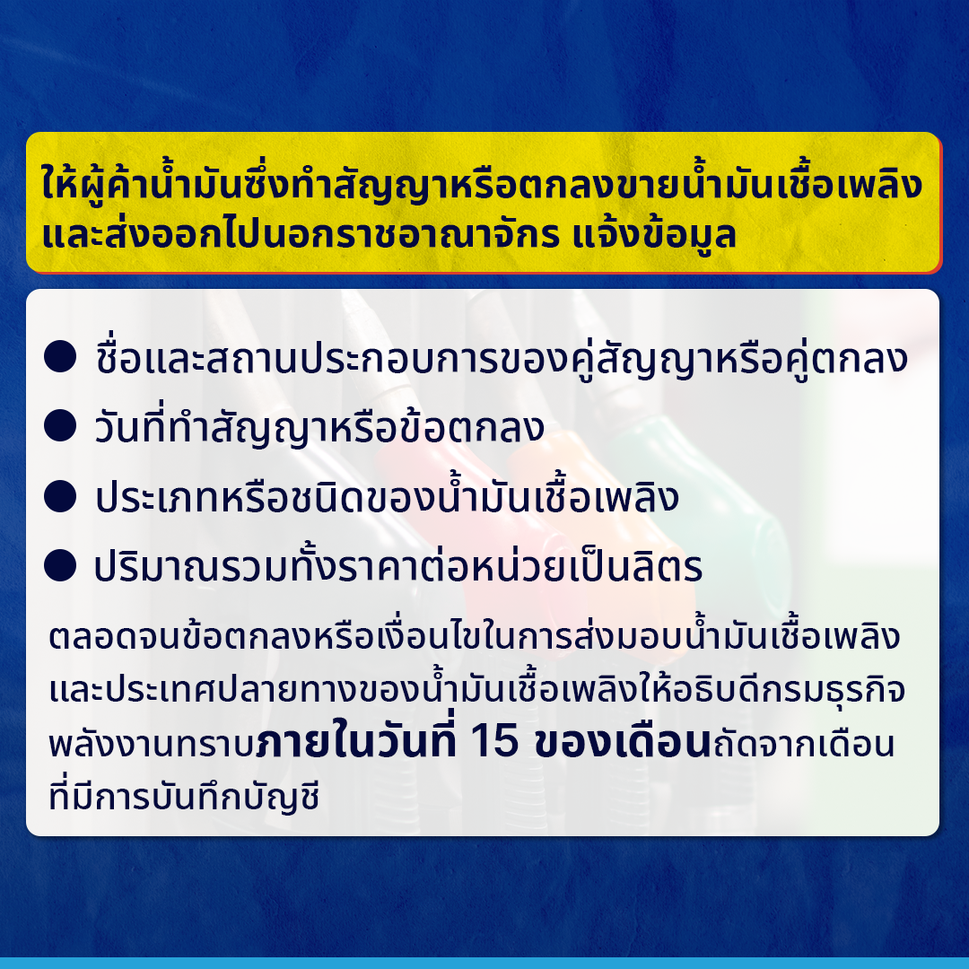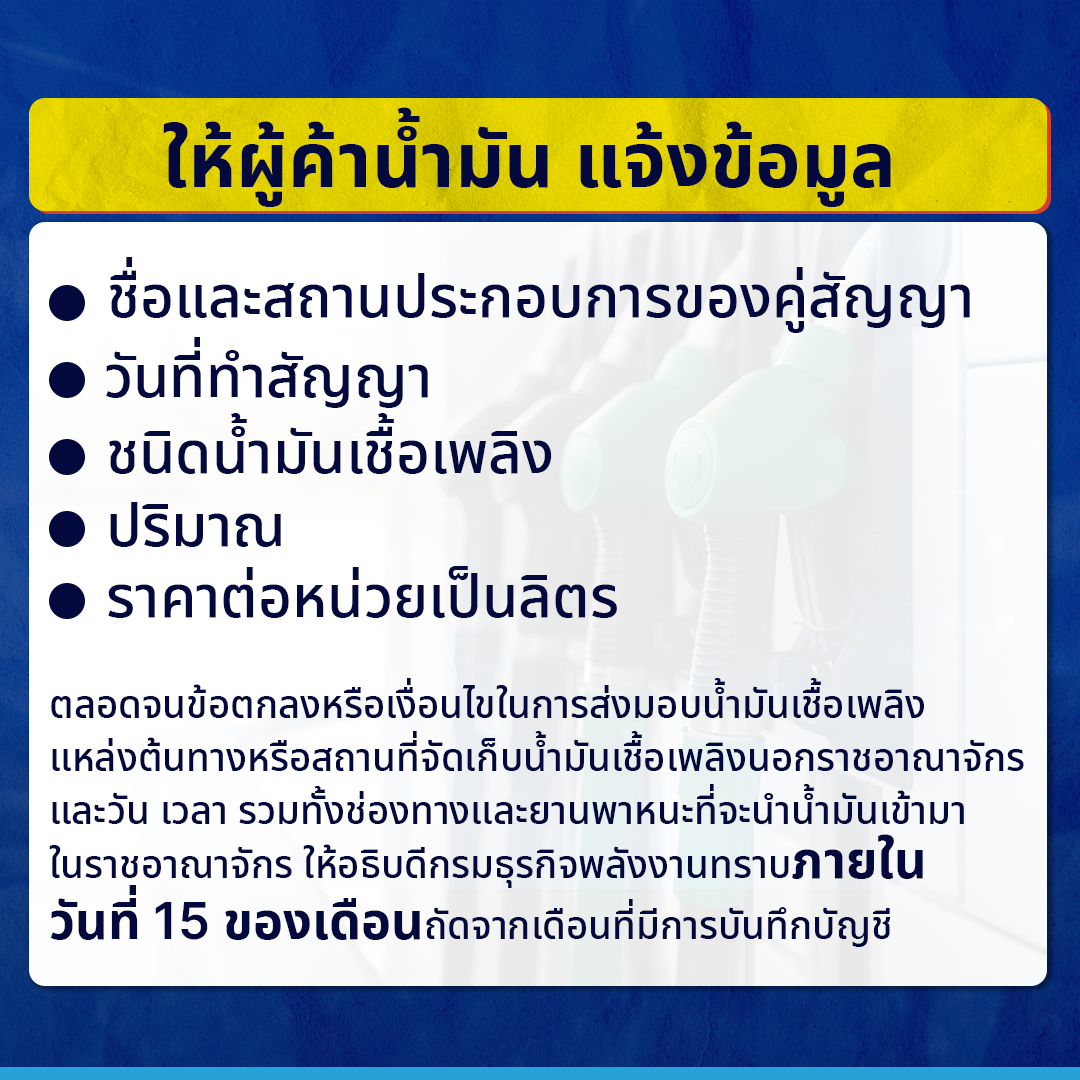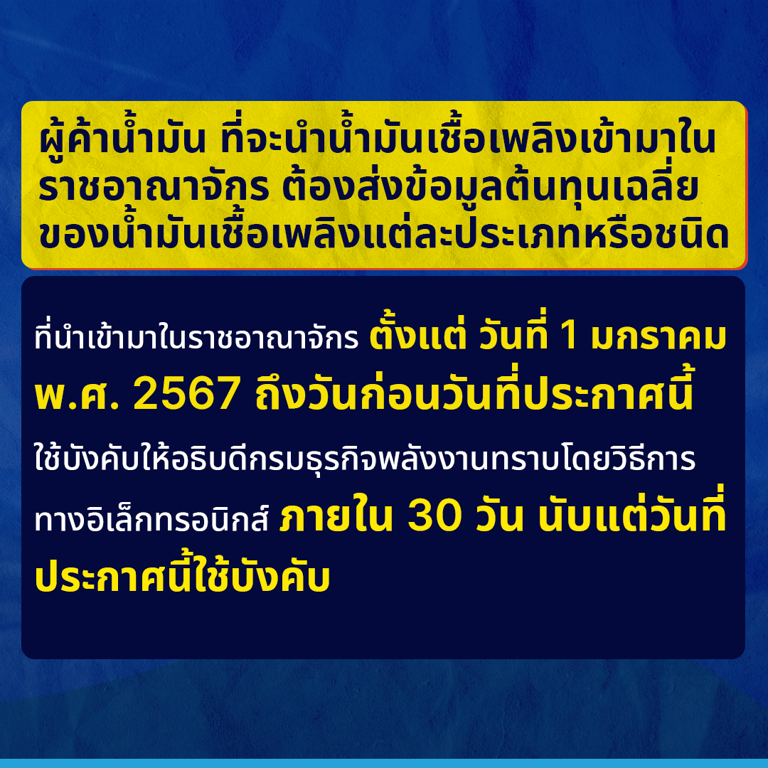 ทั้งนี้ เมื่อวันที่ 13 มีนาคม ราชกิจจานุเบกษาได้เผยแพร่ประกาศกระทรวงพลังงาน เรื่อง การแจ้งข้อมูลเกี่ยวกับการนำเข้าและส่งออกน้ำมันเชื้อเพลิง พ.ศ.2567 ซึ่งให้มีผลใช้บังคับตั้งแต่วันที่ 14 มีนาคม พ.ศ. 2567 เป็นต้นไป โดยประกาศกระทรวงพลังงานฉบับดังกล่าวได้กำหนดให้ผู้ค้าน้ำมันตามมาตรา 7 แห่งพระราชบัญญัติการค้าน้ำมันเชื้อเพลิง พ.ศ. 2543 รายงานข้อมูลรายละเอียดราคาและต้นทุนที่เกี่ยวข้องโดยตรงกับการนำเข้าและการส่งออกน้ำมันเชื้อเพลิงต่ออธิบดีกรมธุรกิจพลังงานทราบ ภายในวันที่ 15 ของเดือนถัดจากเดือนที่มีการบันทึกบัญชีรายวัน