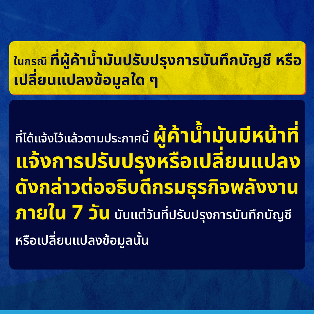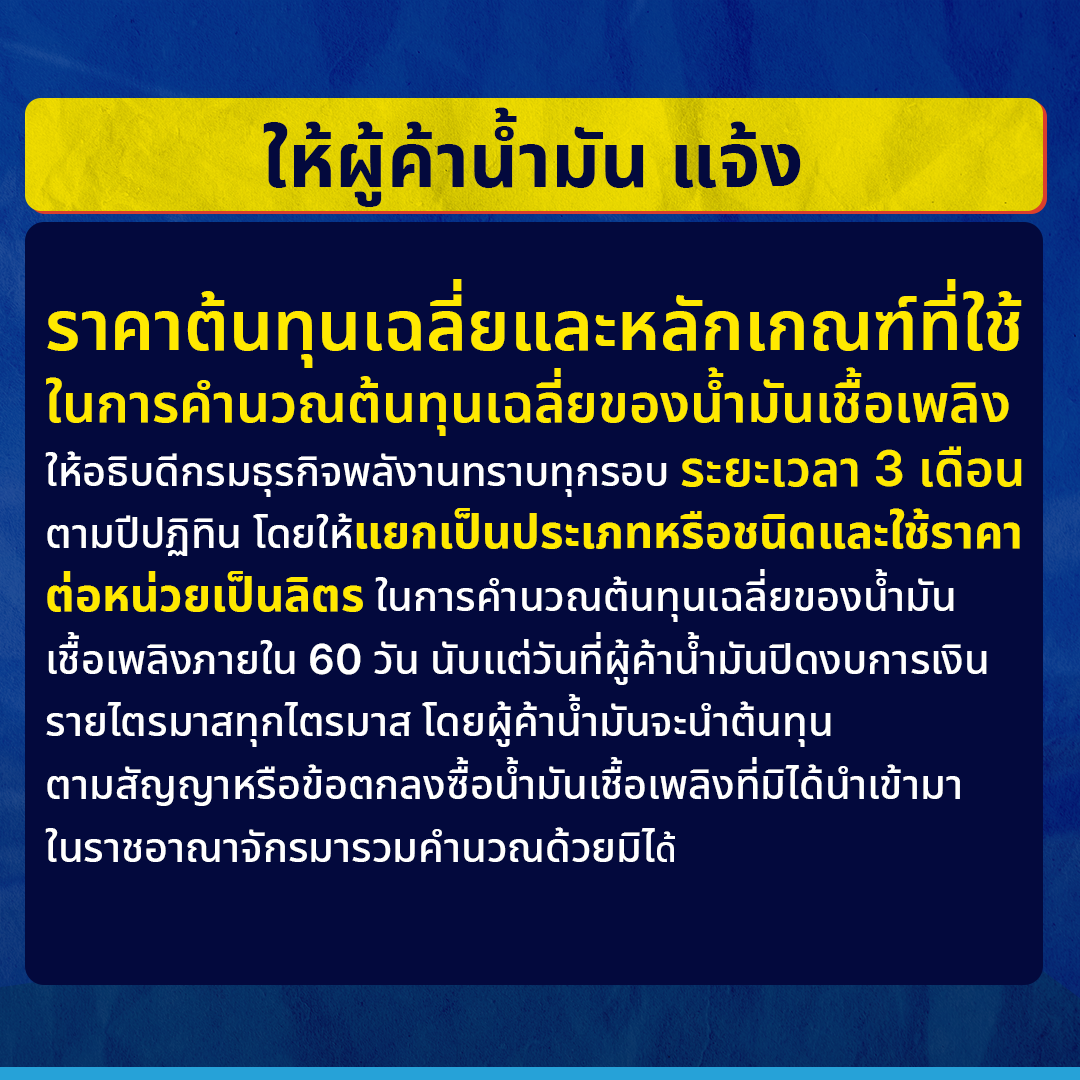 นอกจากนั้น ต้องแจ้งราคาต้นทุนเฉลี่ยและหลักเกณฑ์ที่ใช้ในการคำนวณต้นทุนเฉลี่ยของน้ำมันเชื้อเพลิงในทุกไตรมาส และกรณีที่ผู้ค้าน้ำมันปรับปรุงการบันทึกบัญชี หรือเปลี่ยนแปลงข้อมูล จะต้องแจ้งให้อธิบดีกรมธุรกิจพลังงานทราบภายใน 7 วัน โดยข้อมูลที่ได้รับมาจะถือเป็นข้อมูลลับของทางราชการและมีการเก็บรักษาเป็นความลับอย่างที่สุด