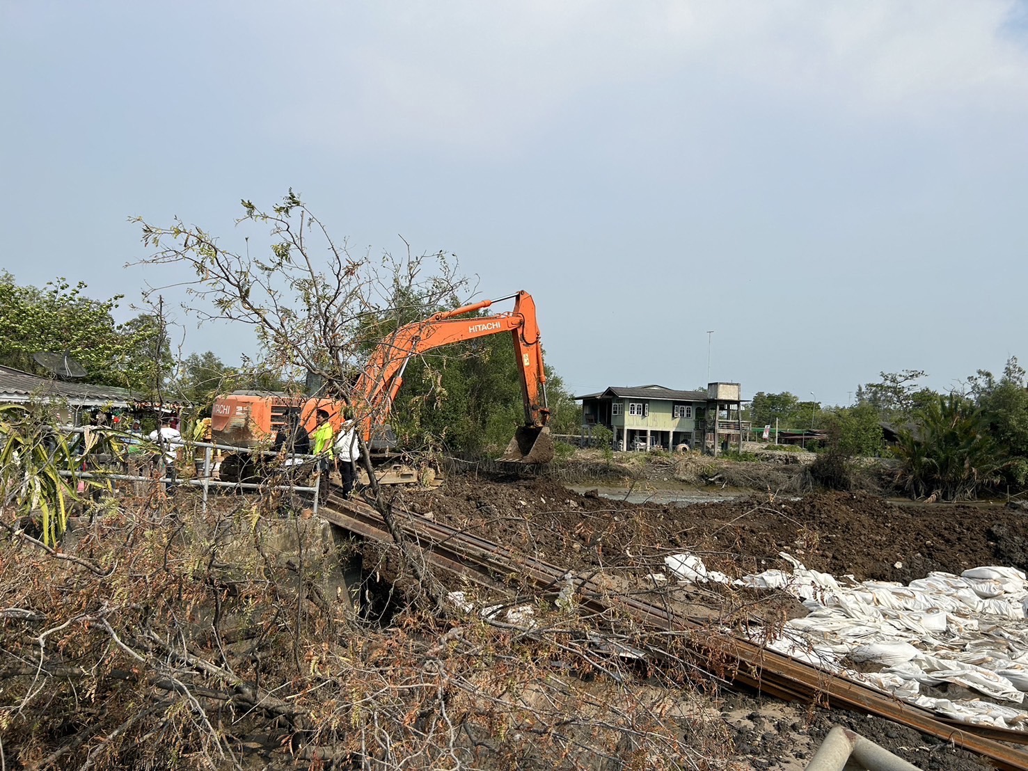 ทั้งนี้ จากสถานการณ์น้ำทะเลหนุนสูงที่เกิดขึ้น พบว่ามีแรงดันน้ำ ทำให้เกิดคันดินทรุดตัว และมีการแก้ไขปัญหาเบื้องต้นไปก่อนหน้านี้ โดยการใช้บิ๊กแบค ขนาด 2 ตัน จำนวน 1,000 ถุง เพื่อแก้ไขปัญหาอุดรอยรั่ว แต่ด้วยแรงดันจากน้ำทะเลหนุน ทำให้ถุงบิ๊กแบคแตก เพราะไม่สามารถรับแรงดันได้ น้ำเค็มจึงทะลักเข้าสู่คลองอีกครั้ง ซึ่งทางกรมชลประทาน ได้มีการรายงานถึงแนวทางการแก้ไขอย่างเร่งด่วนภายในวันนี้ ก่อนช่วงเวลาน้ำทะเลหนุน ในเวลา 17.00-18.00 น. ซึ่งเจ้าหน้าที่กรมชล และผู้รับเหมา จำเป็นต้องเร่งมือในการเสริมคันดินให้แข็งแรง และสูงเพียงพอ ที่จะสามารถรับปริมาณน้ำทะเลหนุนสูงในช่วงนี้ได้ พร้อมแผนดำเนินการสร้างแผ่นเหล็กชีทไพล์ เพื่อเสริมความแข็งแรง ที่จะสามารถรับแรงดันน้ำให้ถาวรมากขึ้น