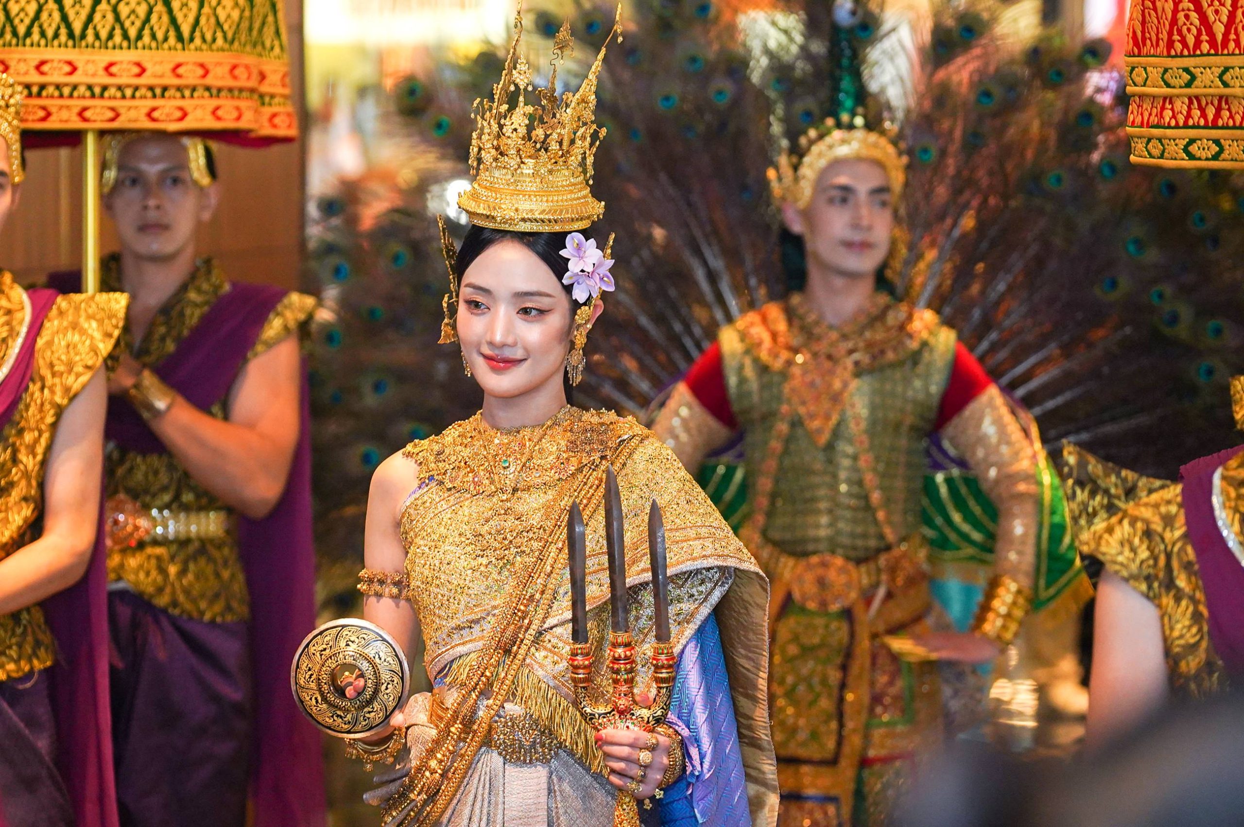 บรรยากาศงาน “ไอคอนสยาม มหัศจรรย์เจ้าพระยามหาสงกรานต์ ๒๕๖๗” วันที่ 5 ในวันนี้บรรดาแฟนคลับต่างมารอชมความงดงามอลังการของขบวนแห่นางสงกรานต์มโหธรเทวี โดย “มินนี่ ณิชา” ไอดอลเกาหลีสัญชาติไทยหนึ่งในสมาชิกวง (G)I- DLE ซึ่งมีชื่อเสียงโด่งดังในระดับโลก มาเป็นนางสงกรานต์มโหธรเทวี ประจำปี 2567 กับการปรากฏโฉมเป็นนางสงกรานต์ครั้งแรกของ “มินนี่ ณิชา” สง่างามด้วยชุดไทยตามแบบอย่างสตรีราชสำนักไทยในสมัยรัตนโกสินทร์ตอนต้น สวมเครื่องประดับสังวาลย์ทองคำแท้ ช่วงสมัยรัชกาลที่ 4 เช่น สังวาลตะขาบอ่อน เป็นงานไทยโบราณที่ปัจจุบันไม่มีผู้ใดทำได้ รวมถึงเข็มขัดเพชรที่เป็นสมบัติของเจ้าจอมมารดาแพร ในสมัยรัชกาลที่ 5 สวมรัดเกล้าเปลวแบบโบราณและเครื่องประดับทองคำ กรองคอ ทับทรวง ต่างหู ธำมรงค์ กำไล รัดแขน ปั้นเหน่ง เข็มขัดทางมะพร้าว ข้อเท้าทองคำล้วน ซึ่งล้วนมีความงดงามวิจิตรแบบไทยอย่างสมบูรณ์แบบ
