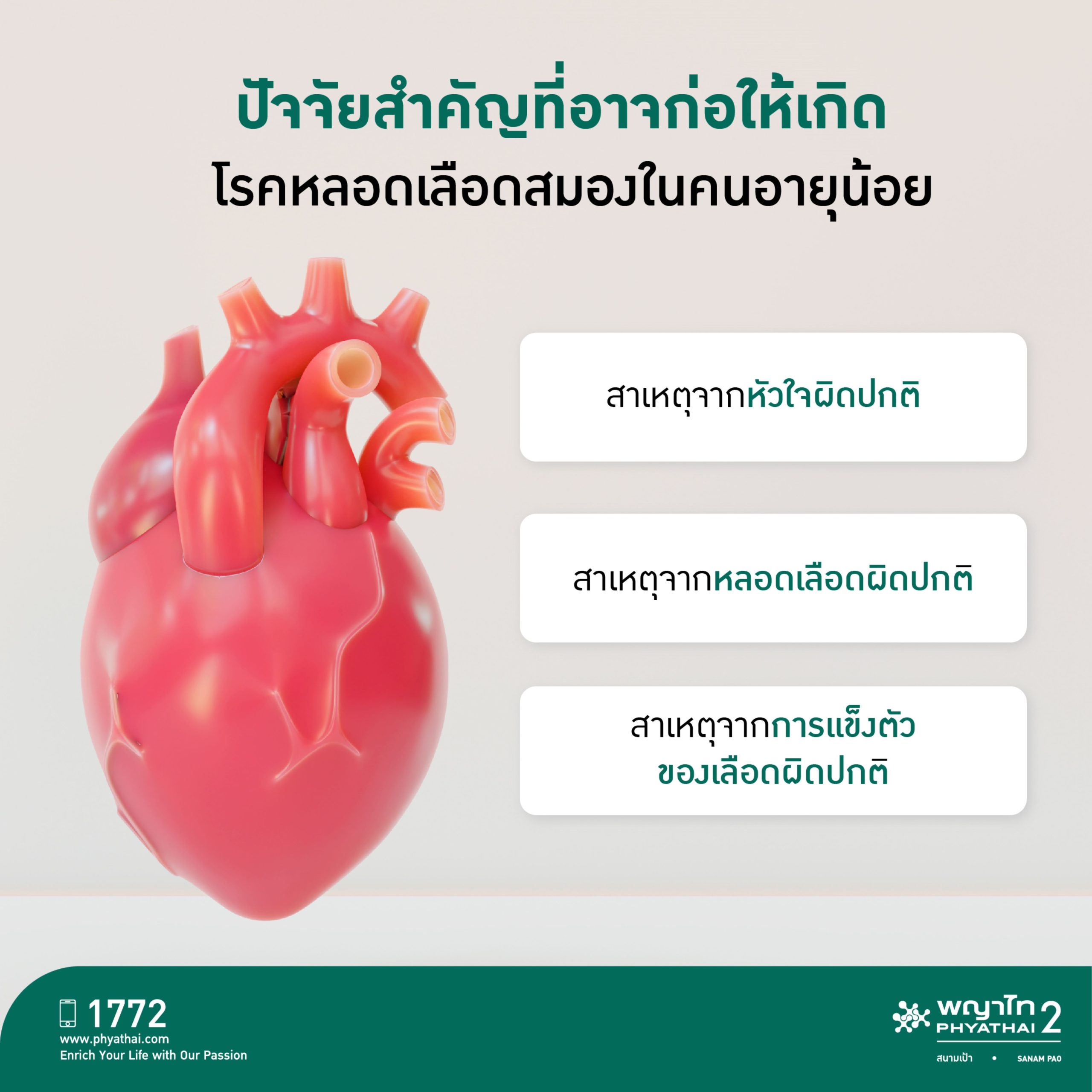 พญ. จิรัชญา ดีสุวรรณ อายุรแพทย์ระบบประสาทและสมอง ศูนย์สมองและระบบประสาท โรงพยาบาลพญาไท 2 เผยถึงสาเหตุของการเกิดโรคหลอดเลือดสมองในคนอายุน้อย มักมาจากผู้ที่มีโรคประจำตัวอยู่แล้วได้แก่ โรคหัวใจ เบาหวาน ความดันโลหิตสูง ไขมันในเลือดสูง ผู้ที่สูบบุหรี่ ขาดการออกกำลังกาย มีภาวะเครียด และโรคอ้วน
