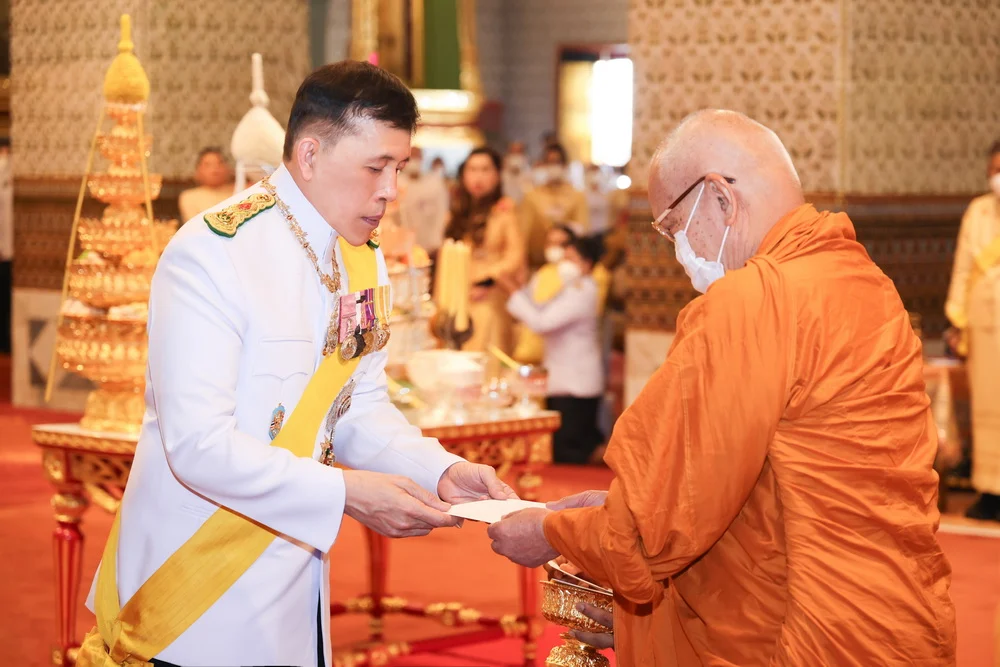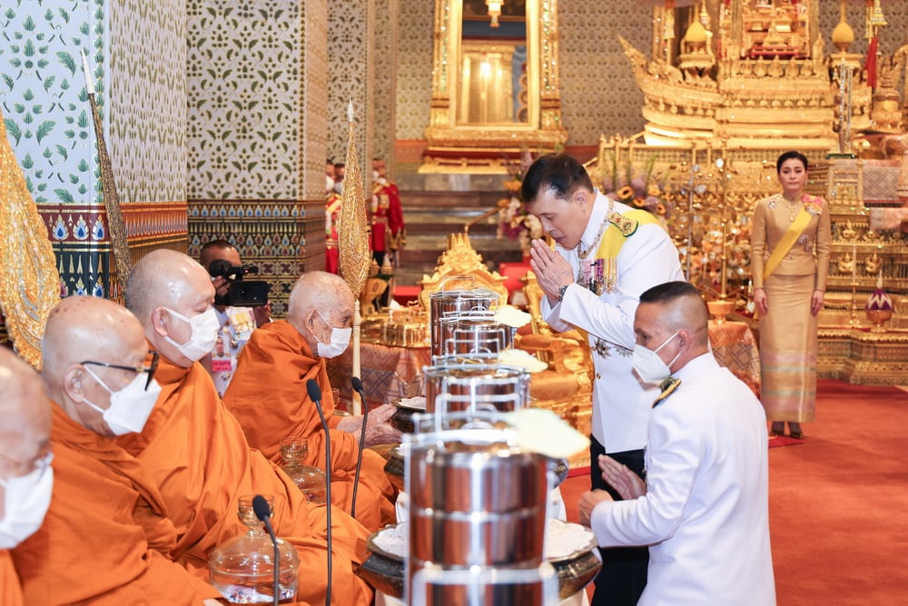 ครั้นเสด็จพระราชดำเนินถึง พระบาทสมเด็จพระเจ้าอยู่หัว ทรงจุดธูปเทียนเครื่องนมัสการพานทองสองชั้นบูชาพระพุทธปฏิมาชัยวัฒน์ รัชกาลที่ 1 ถึงรัชกาลที่ 7 และรัชกาลที่ 9 ที่หน้าพระที่นั่งบุษบกมาลา ทรงกราบ ทรงศีล สมเด็จพระอริยวงศาคตญาณ สมเด็จพระสังฆราช สกลมหาสังฆปริณายก ถวายศีล พระสงฆ์ถวายพรพระ จบแล้ว เสด็จพระราชดำเนินไปทรงประเคนปิ่นโตภัตตาหารแด่สมเด็จพระอริยวงศาคตญาณ สมเด็จพระสังฆราช สกลมหาสังฆปริณายก