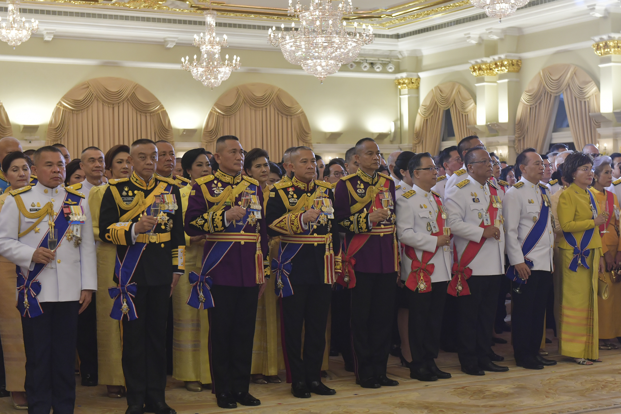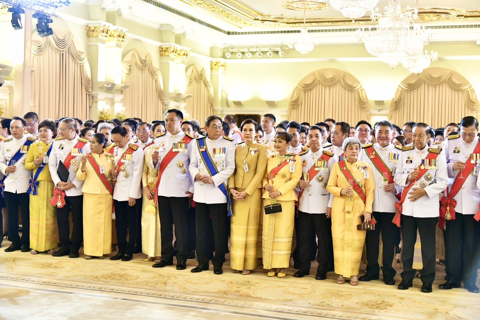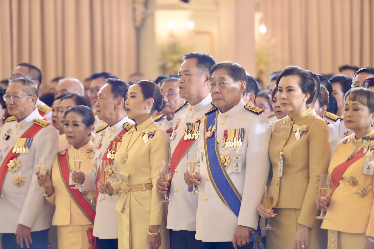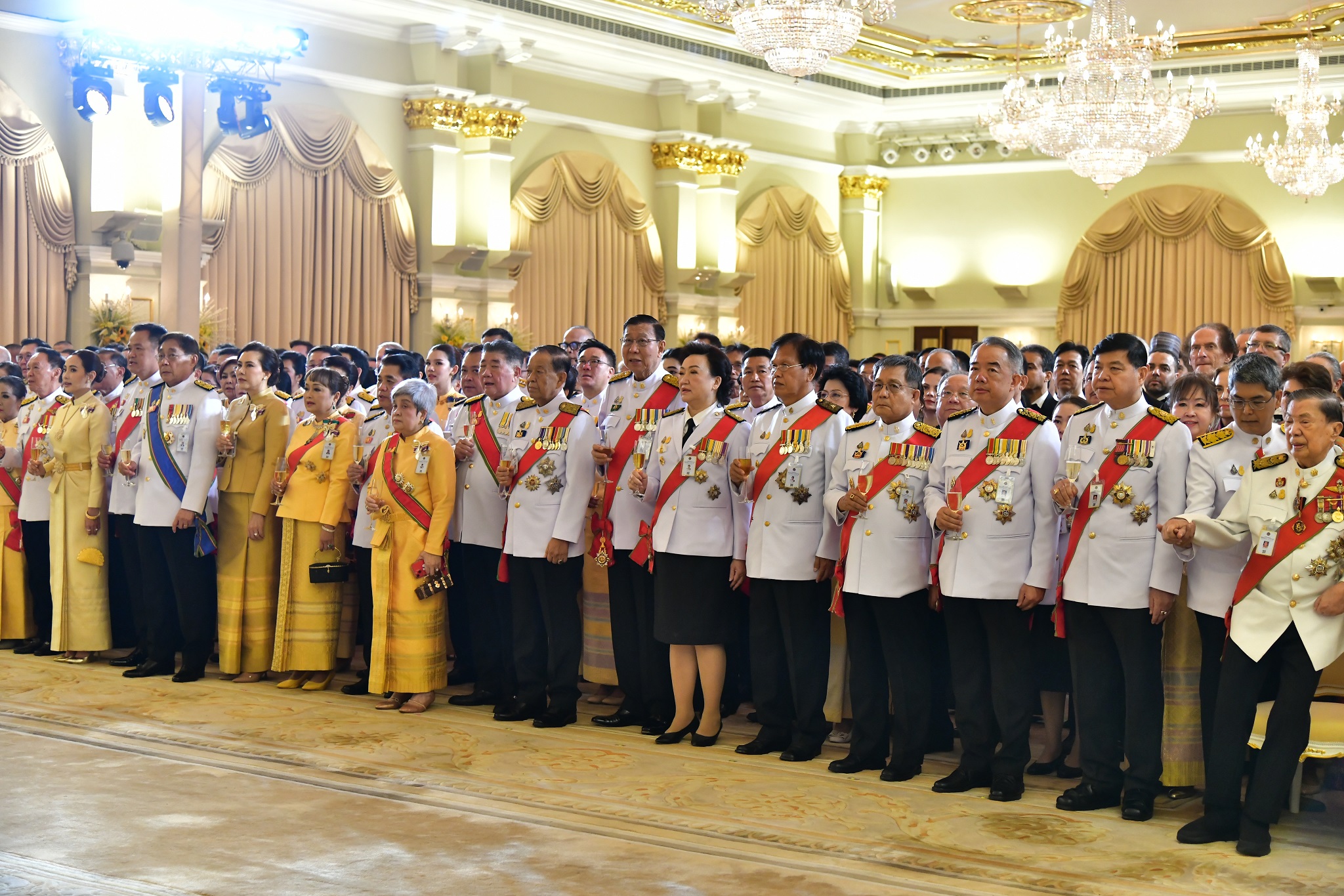 ต่อจากนั้น วงดนตรีบรรเลงเพลงสรรเสริญพระบารมี จบแล้ว นายกรัฐมนตรีและผู้มีเกียรติที่มาร่วมงานกล่าว “ทรงพระเจริญ” 3 ครั้ง เสร็จแล้วนายกรัฐมนตรีและผู้มีเกียรติดื่มถวายพระพรชัยมงคลแด่พระบาทสมเด็จพระเจ้าอยู่หัว วงดนตรีบรรเลงเพลงสดุดีจอมราชา 2 จบ เป็นอันเสร็จพิธี