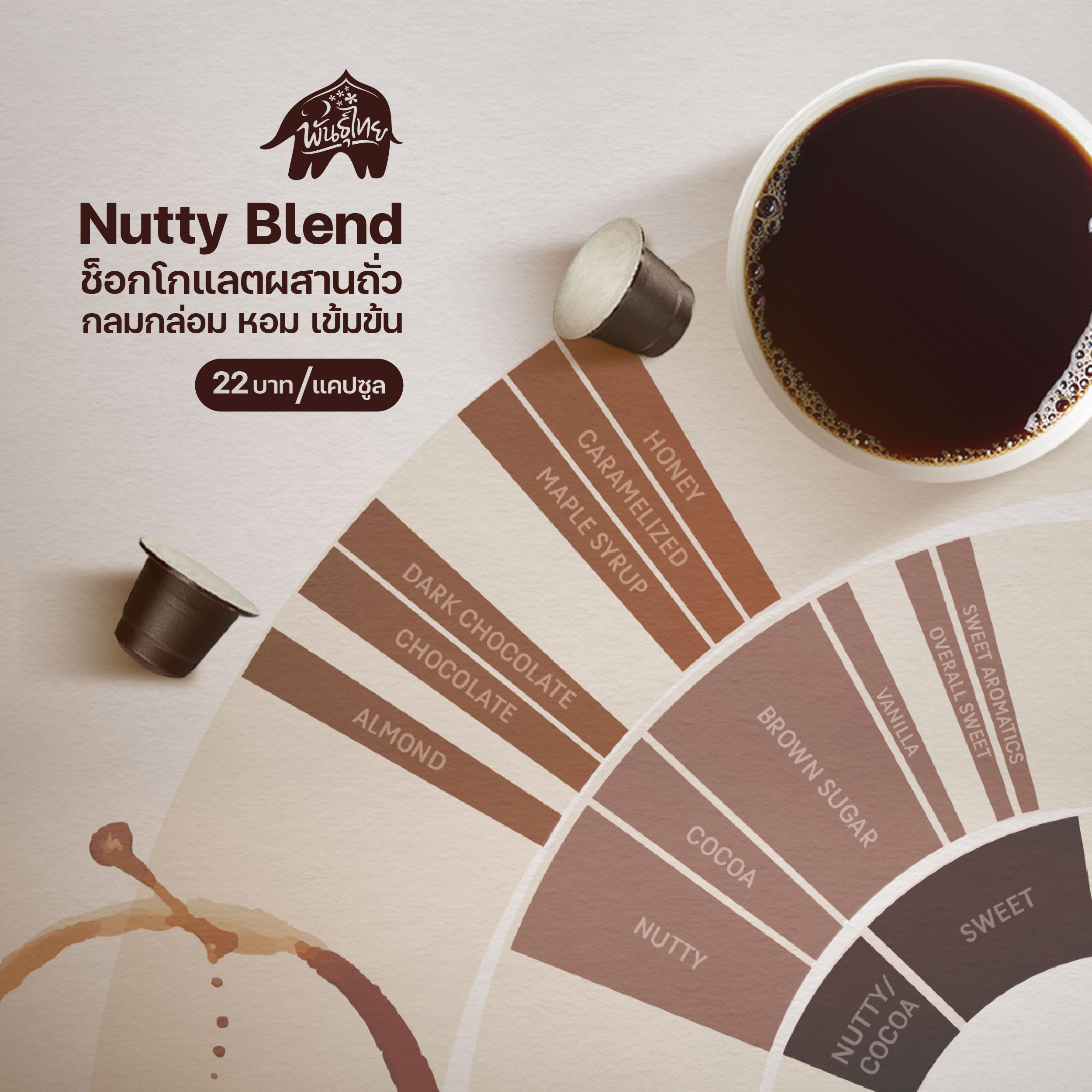 - กาแฟแคปซูลพันธุ์ไทย นัตตี้ เบลนด์ (Punthai Coffee Capsule – Nutty Blend) กาแฟคั่วกลางไปทางเข้ม อาราบิก้าไทย เบลนด์ด้วยกาแฟอาราบิก้าจากบราซิลและฮอนดูรัส เหมาะกับผู้ที่ชื่นชอบบอดี้ปานกลาง เข้มข้นและขมน้อย กลิ่นและรสชาติออกแนวดาร์คโกโก้ มีความหอมของช็อกโกแลต ปนอัลมอนด์ ฟีลวนิลาและบัตเตอร์สก๊อต เหมาะกับเมนูใส่นม หรือจะดื่มแบบไลท์ๆ ก็กลมกล่อม ราคากล่องละ 220 บาท
