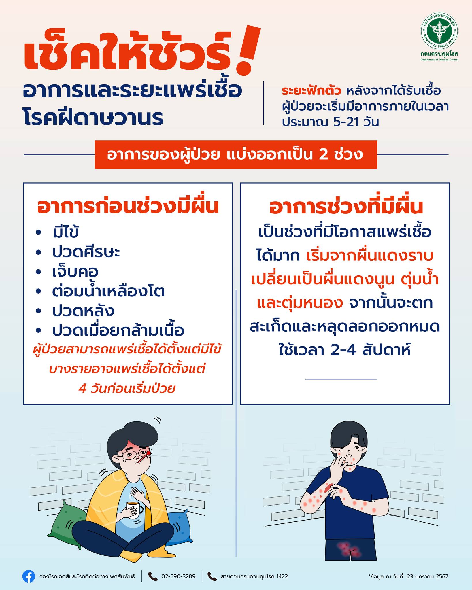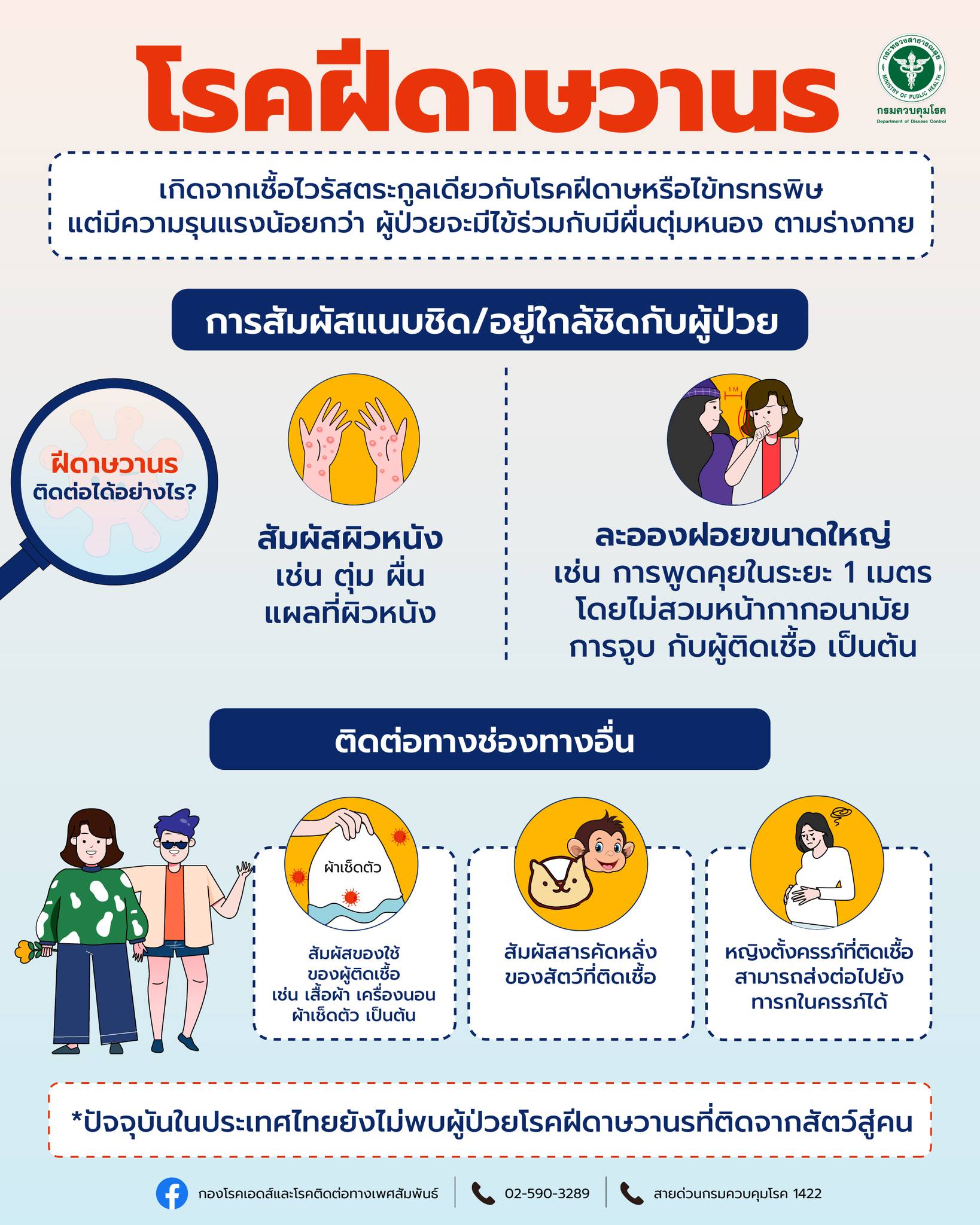 กรมควบคุมโรค เผยสถานการณ์โรคฝีดาษวานรในประเทศไทย ยังพบผู้ป่วยเป็นระยะ และมีแนวโน้มเพิ่มสูงขึ้นในช่วงเดือนพฤษภาคม โดยทั่วไปโรคมีความรุนแรงน้อย แต่จะมีความรุนแรงมากขึ้นในกลุ่มผู้ป่วยภูมิคุ้มกันต่ำ ติดจากการสัมผัสแนบชิดกับผู้ป่วย ผู้ที่มีผื่น ตุ่ม หรือหนอง แนะนำป้องกันตัวเอง โดยเฉพาะ กิจกรรมที่มีโอกาสนำไปสู่การมีเพศสัมพันธ์กับคนไม่รู้จัก หรือกิจกรรมที่มีการรวมตัวของคนจำนวนมากที่อาจเสี่ยงติดโรคจากการสัมผัสผิวหนังหรือสารคัดหลั่ง ส่วนโอกาสรับเชื้อจากการพูดคุยใกล้ชิดเป็นระยะเวลานาน เป็นไปได้ค่อนข้างต่ำ
