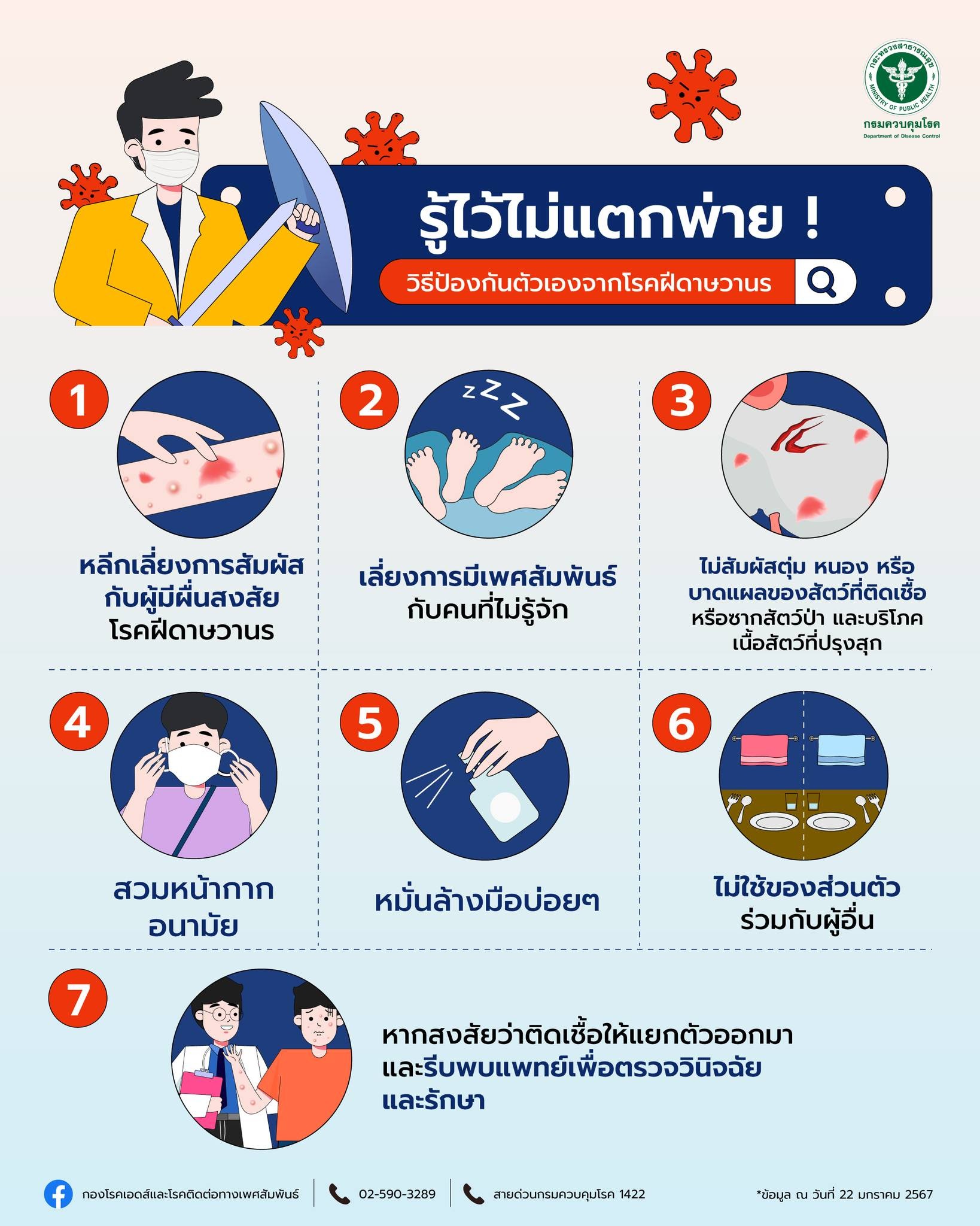 นายแพทย์วีรวัฒน์ กล่าวเพิ่มเติมว่า ประชาชนทุกคนไม่ควรประมาท โรคฝีดาษวานรติดได้ทุกคน หากมีพฤติกรรมเสี่ยง สามารถป้องกันโรคฝีดาษวานรได้ ดังนี้