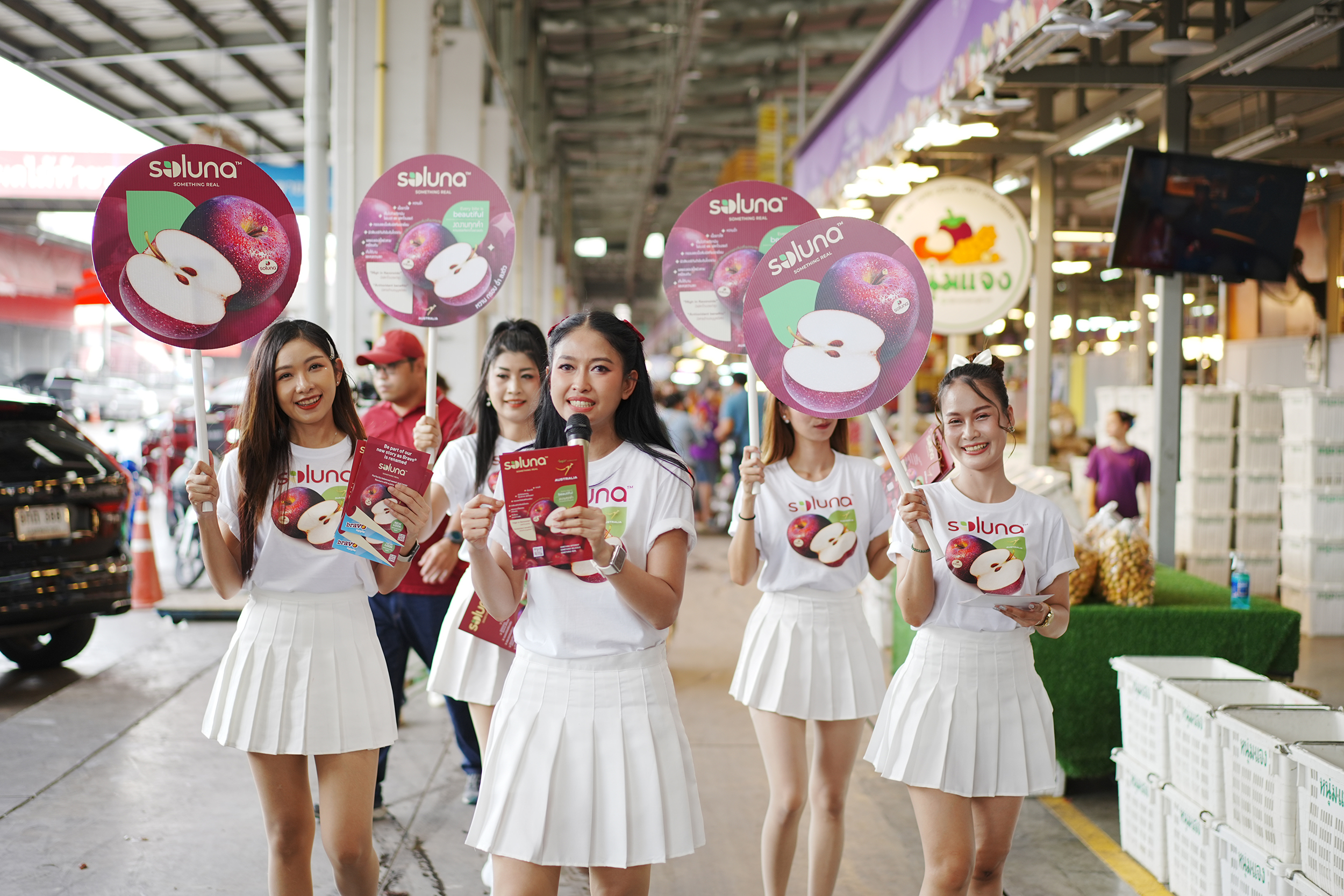 โซลูน่า แอปเปิล จัดขบวนประชาสัมพันธ์ ลงพื้นที่ตลาดสี่มุมเมือง นำโดยผู้ดูแลการตลาด โซลูน่า แอปเปิล คุณฌอน เอนเกลเบรชท์ ผู้จัดการฝ่ายขายและการตลาด ประเทศออสเตรเลีย บริษัทดับเบิลยูเอ ฟาร์มไดเร็ค จำกัด และผู้นำเข้า คุณพีราวิชญ์ ภัทรประสิทธิ์ กรรมการฝ่ายพัฒนาธุรกิจ การลงทุน และ การค้า วัน ตลาด คอร์ปอเรชั่น อีกทั้งได้รับเกียรติจาก คุณเอสเธอร์ ซัน, ที่ปรึกษา (การพาณิชย์) และข้าหลวงพาณิชย์,สำนักงานการพาณิชย์และการลงทุนออสเตรเลีย ประจำประเทศไทย (ออสเทรด) สำนักงานการพาณิชย์และการลงทุนออสเตรเลียประจำประเทศไทย และ ทีมบริหารตลาดสี่มุมเมืองนำทีมโดย คุณอนล ภัทรประสิทธิ์, ผู้ช่วยกรรมการผู้จัดการ พร้อมด้วย คุณทรงกลด พุฒิกมลกุล, ผู้ช่วยกรรมการผู้จัดการ, คุณไอริณ ภัทรประสิทธิ์, ผู้อำนวยการสายงานพัฒนาองค์กร และ คุณอภิวัฒน์ สุขพันธ์, ผู้อำนวยการสายงานบริหารพื้นที่ ร่วมขบวนทักทายกลุ่มร้านค้าส่งผลไม้พรีเมียมในตลาดสี่มุมเมืองไปพร้อมกัน