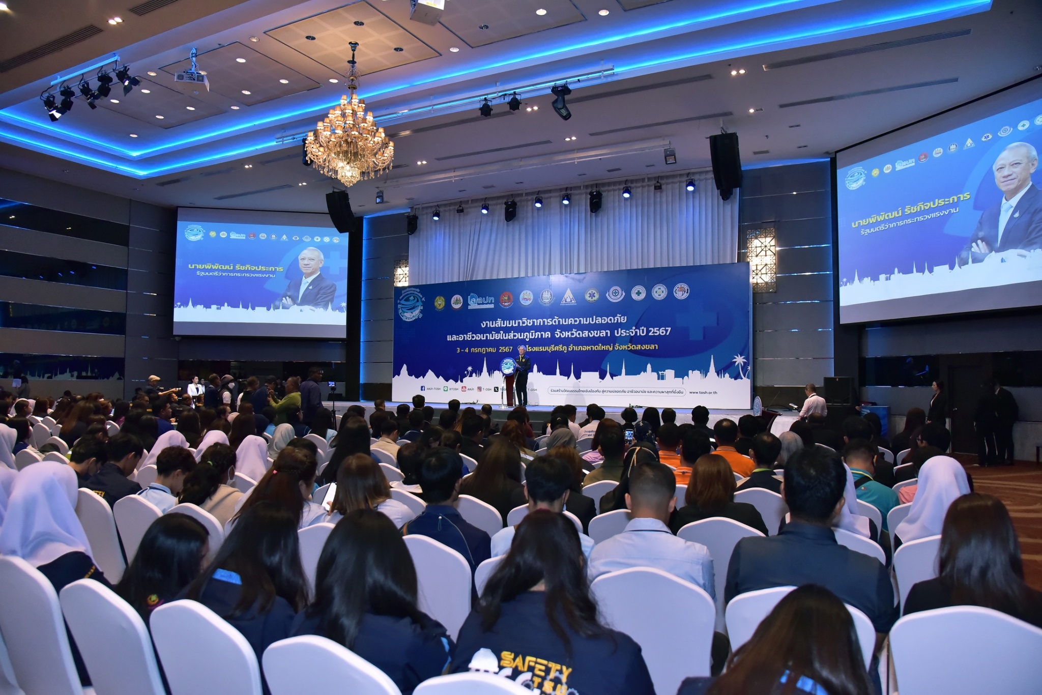 โดยมี นายภูมิพัฒน์ เหมือนจันทร์ โฆษกกระทรวงแรงงาน ร่วมเป็นเกียรติ นายสมนึก พรหมเขียว ผู้ว่าราชการจังหวัดสงขลา กล่าวต้อนรับ นายบัญชา ศรีธนาอุทัยกร รองผู้อำนวยการ สถาบันส่งเสริมความปลอดภัย อาชีวอนามัยและสภาพแวล้อมในการทำงาน (องค์การมหาชน) กล่าวรายงานวัตถุประสงค์ในการจัดงาน หัวหน้าส่วนราชการกระทรวงแรงงานจังหวัดสงขลา ร่วมให้การต้อนรับ ณ ห้องแกรนด์บอลรูม 1 โรงแรมบุรีศรีภู หาดใหญ่ อำเภอหาดใหญ่ จังหวัดสงขลา