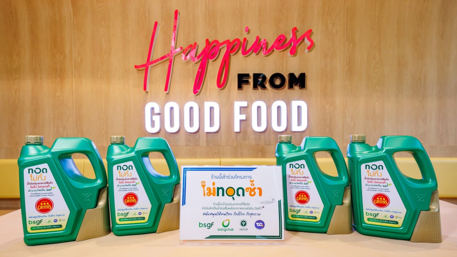 โดยลงนามความร่วมมือกับ BSGF ในกลุ่มบริษัทบางจาก และบริษัท ธนโชค ออยล์ไลท์ จำกัด ในโครงการ ‘ไม่ทอดซ้ำ’ และ ‘ทอดไม่ทิ้ง’ เพื่อรณรงค์ให้ผู้ประกอบการอาหารไม่ใช้น้ำมันปรุงอาหารที่ไม่ได้คุณภาพมาทอดซ้ำ และส่งเสริมการจัดการน้ำมันที่ใช้แล้วอย่างถูกวิธี ด้วยการนำไปเป็นวัตถุดิบสำหรับผลิตน้ำมันเชื้อเพลิงอากาศยานยั่งยืน (Sustainable Aviation Fuel – SAF)
