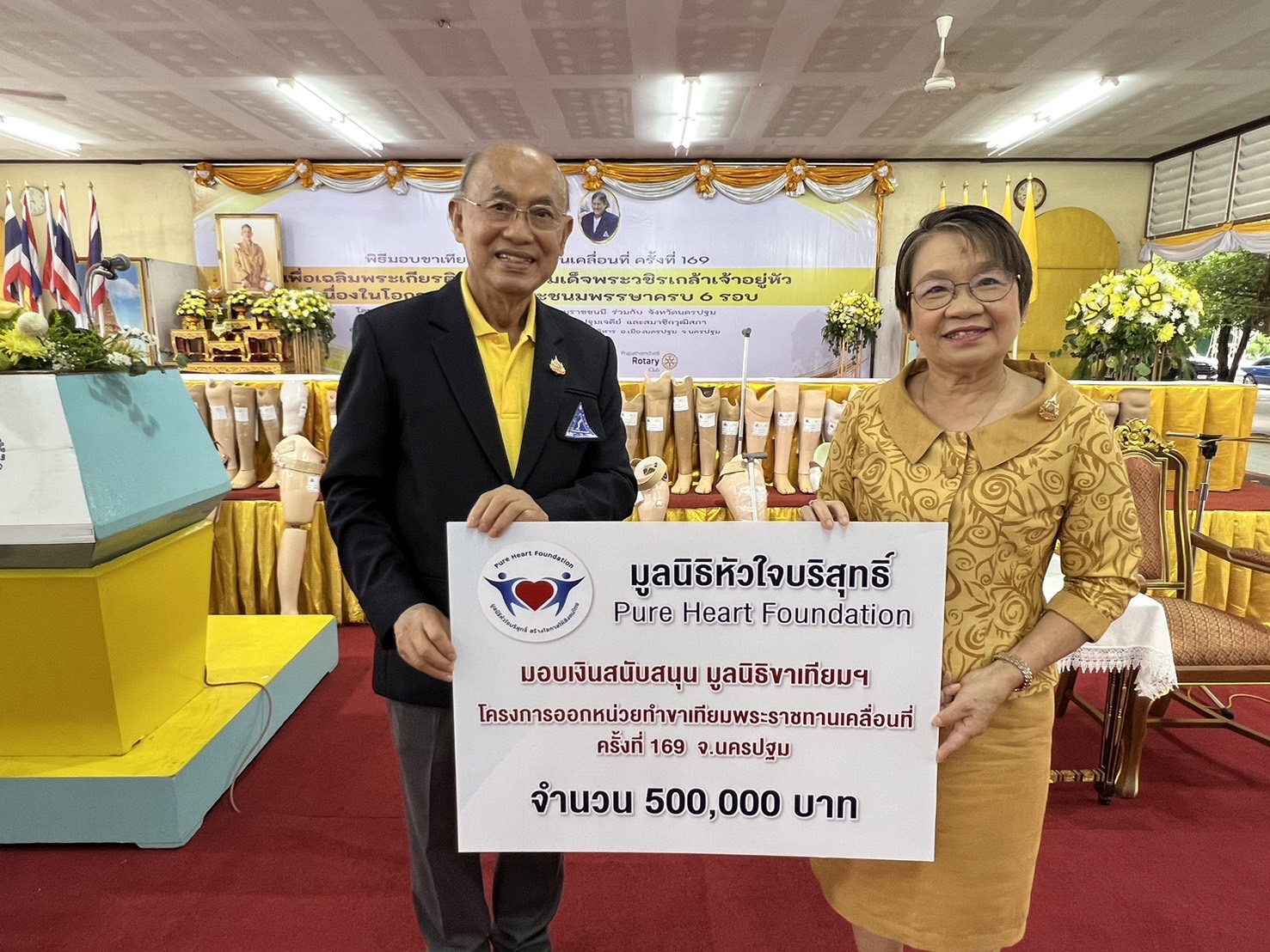 19 กรกฎาคม 2567 นางเธียรรัตน์ นะวะมะวัฒน์ ประธานมูลนิธิหัวใจบริสุทธิ์ พร้อมด้วย นางสาวกุลพรภัสร์ วงศ์มาจารภิญญา ประธานเจ้าหน้าที่บริหาร กลุ่มไทยสมายล์บัส เป็นตัวแทนมอบเงินสนับสนุนโครงการออกหน่วยทำขาเทียมพระราชทานเคลื่อนที่ ครั้งที่ 169 จังหวัดนครปฐม ให้แก่ มูลนิธิขาเทียม ในสมเด็จพระศรีนครินทราบรมราชชนนี