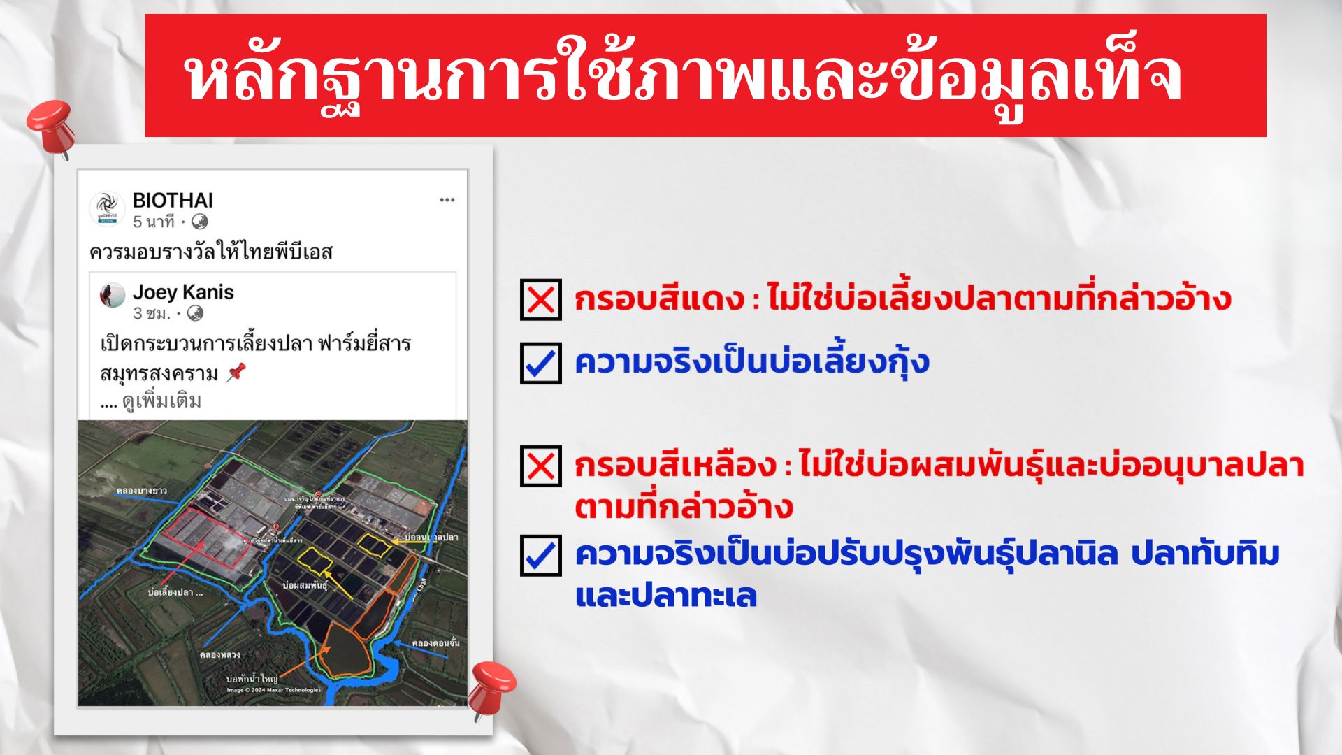 สำหรับภาพสุดท้ายเป็นภาพถ่ายทางอากาศของบริเวณฟาร์ม โดยมีการระบุผังของฟาร์ม ซึ่งมีข้อความอันเป็นเท็จ กล่าวคือ กรอบสีแดง ไม่ใช่บ่อเลี้ยงปลาตามที่กล่าวอ้าง ความเป็นจริงคือเป็นบ่อเลี้ยงกุ้ง ขณะที่กรอบสีเหลืองที่ระบุว่าเป็นบ่อผสมพันธุ์ปลาและบ่ออนุบาลปลาตามที่กล่าวอ้างนั้น ความจริงคือเป็นบ่อปรับปรุงพันธุ์ปลานิล ปลาทับทิม และปลาทะเล