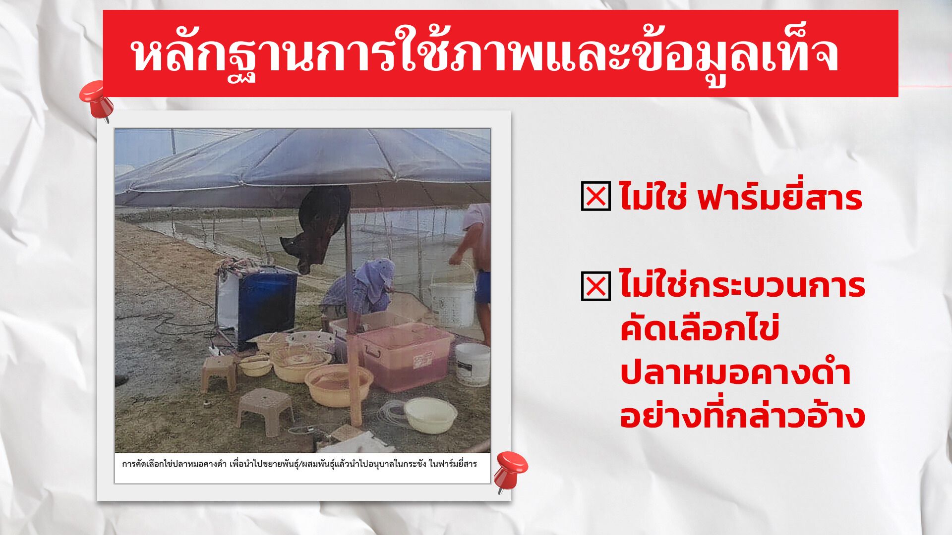 ภาพที่สอง เป็นภาพที่กล่าวอ้างว่าเป็นการคัดเลือกไข่ปลาหมอคางดำ เพื่อนำไปขยายพันธุ์/ผสมพันธุ์แล้วนำไปอนุบาลในกระชังในฟาร์มยี่สาร ความเป็นจริงแล้วสถานที่นี้ไม่ใช่ฟาร์มยี่สาร และกิจกรรมดังปรากฎในภาพนี้ ไม่ใช่กระบวนการคัดเลือกไข่ปลาตามวิธีปฏิบัติของบริษัท