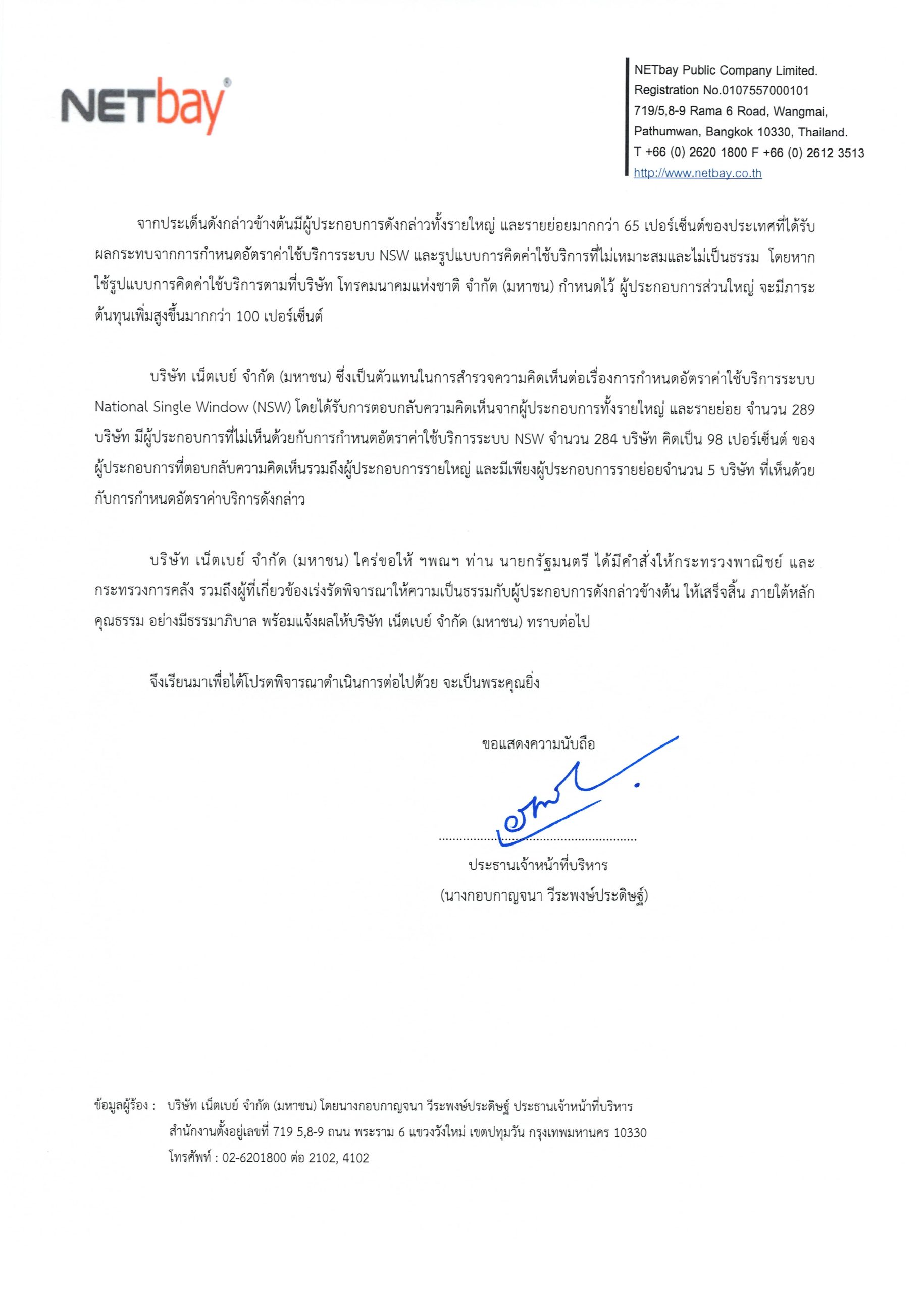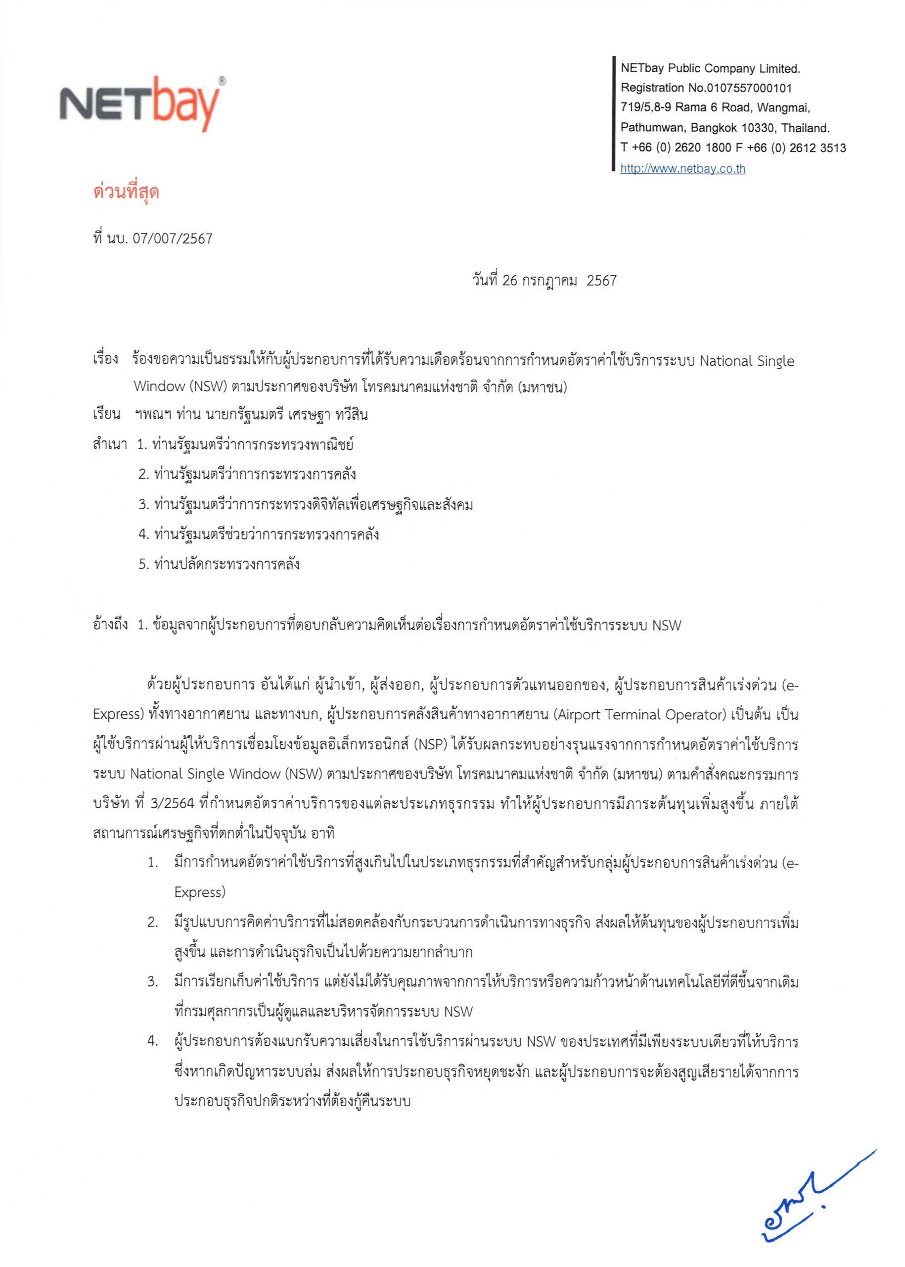 ดังนั้น เมื่อวันที่ 26 กรกฎาคม 2567 บริษัทเน็ตเบย์ ซึ่งเป็นตัวแทนผู้ประกอบการได้ยื่นหนังสือถึง นายเศรษฐา ทวีสิน นายกรัฐมนตรี, รัฐมนตรีว่าการกระทรวงพาณิชย์, รัฐมนตรีว่าการกระทรวงการคลัง, รัฐมนตรีช่วยว่าการกระทรวงการคลัง, ปลัดกระทรวงการคลัง, และ รัฐมนตรีว่าการกระทรวงดิจิทัลเพื่อเศรษฐกิจและสังคม เพื่อขอความเป็นธรรมจากกรณีที่ NT กำหนดอัตราค่าบริการธุรกรรมแต่ละประเภททำให้ผู้ประกอบการต้องรับภาระต้นทุนสูงขึ้น