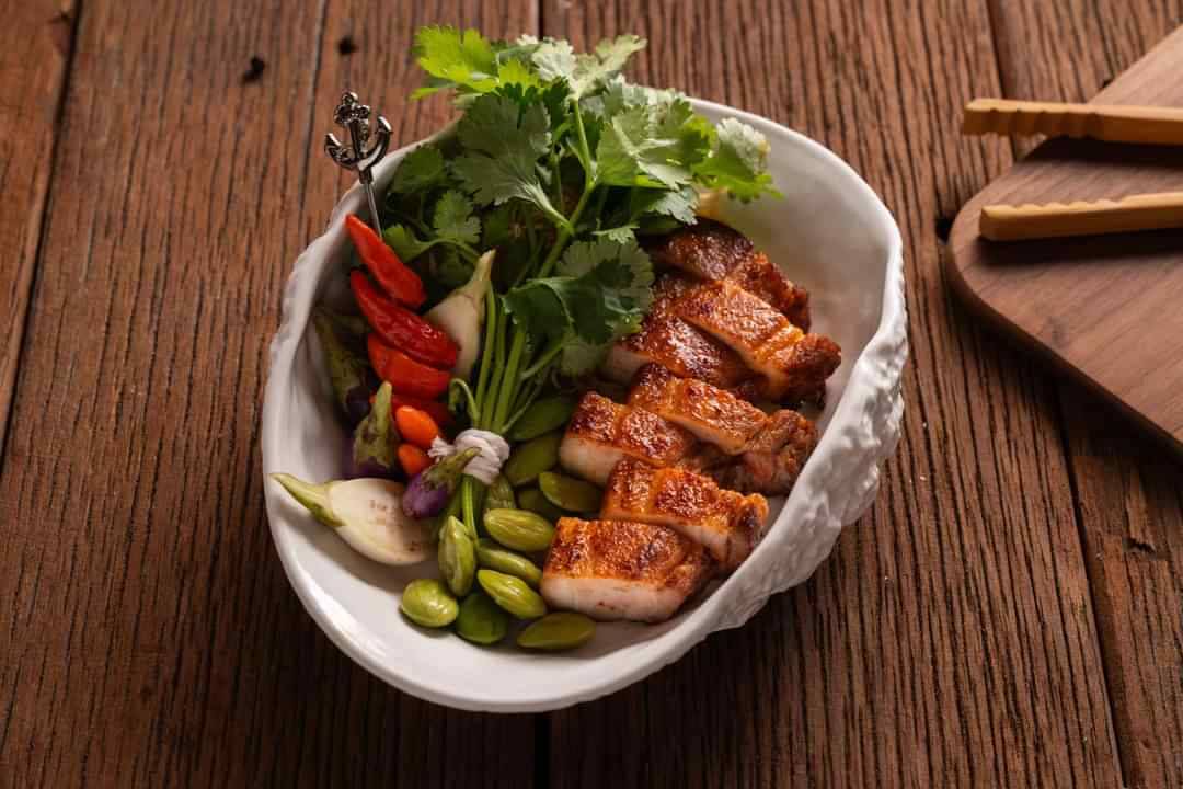 - เนื้อย่างกรอบน้ำจิ้มดาหลาและอาจาดมะละกอ