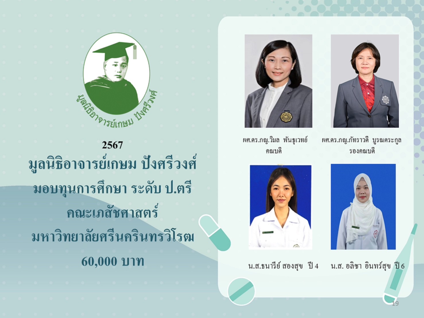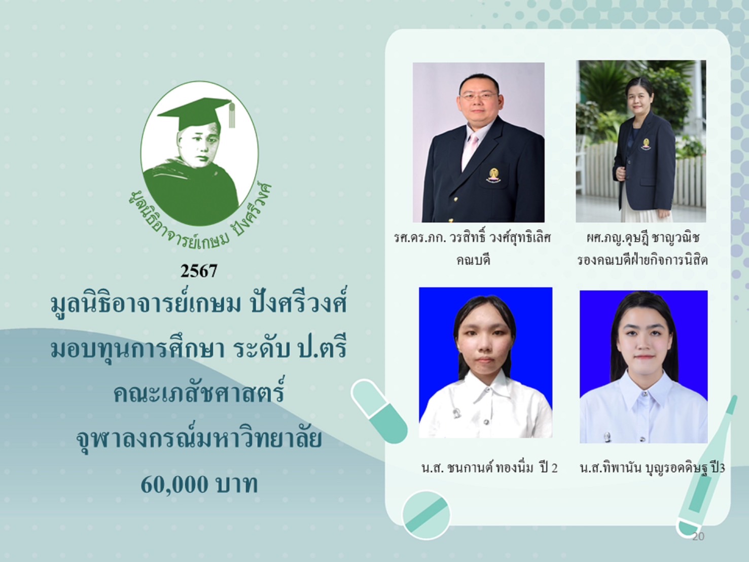 ทั้งนี้ พิธีมอบทุนการศึกษา งานวิจัย และโครงการด้านเภสัชศาสตร์ ประจำปี 2567 มูลนิธิอาจารย์เกษม ปังศรีวงศ์ ได้รับเกียรติจาก เภสัชกร ศาสตราจารย์พิเศษ ดร.จอมจิน จันทรสกุล พร้อมทั้ง คุณธีรวัลคุ์ และคุณพงศ์ศิษฏ์ ปังศรีวงศ์ เป็นตัวแทนคุณธีระพงศ์ ปังศรีวงศ์ ประธานกรรมการมูลนิธิฯ ร่วมเป็นประธานในการมอบทุนฯ ยอดเงินรวม 2,547,500 บาท