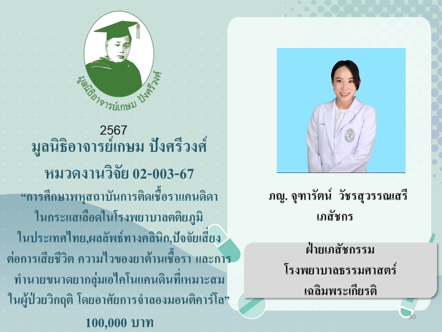 2.3 โครงการงานวิจัย “การศึกษาพหุสถาบันการติดเชื้อราแคนดิดาในกระแสเลือดใน รพ.ตติยภูมิในประเทศไทย: ผลลัพธ์ทางคลินิก, ปัจจัยเสี่ยงต่อการเสียชีวิต, ความไวของยาต้านเชื้อรา และการทำนายขนาดยากลุ่มเอโคโนแคนดินที่เหมาะสมในผู้ป่วยวิกฤติ โดยอาศัยการจำลอง Monte Carlo” มอบให้ ภญ.จุฑารัตน์ วัชรสุวรรณเสรี โรงพยาบาลธรรมศาสตร์เฉลิมพระเกียรติ เป็นเงิน 100,000 บาท