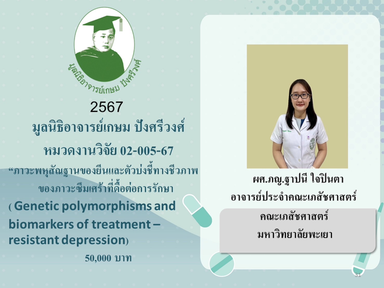 2.4 โครงการงานวิจัย “ภาวะพหุสัณฐานของยีนและตัวบ่งชี้ทางชีวภาพของภาวะซึมเศร้าที่ดื้อต่อการรักษา” (วิทยานิพนธ์ ปริญญาเอก) มอบให้ ผศ.ภญ.ฐาปนี ใจปินตา คณะเภสัชศาสตร์ มหาวิทยาลัยพะเยา เป็นเงิน 50,000 บาท