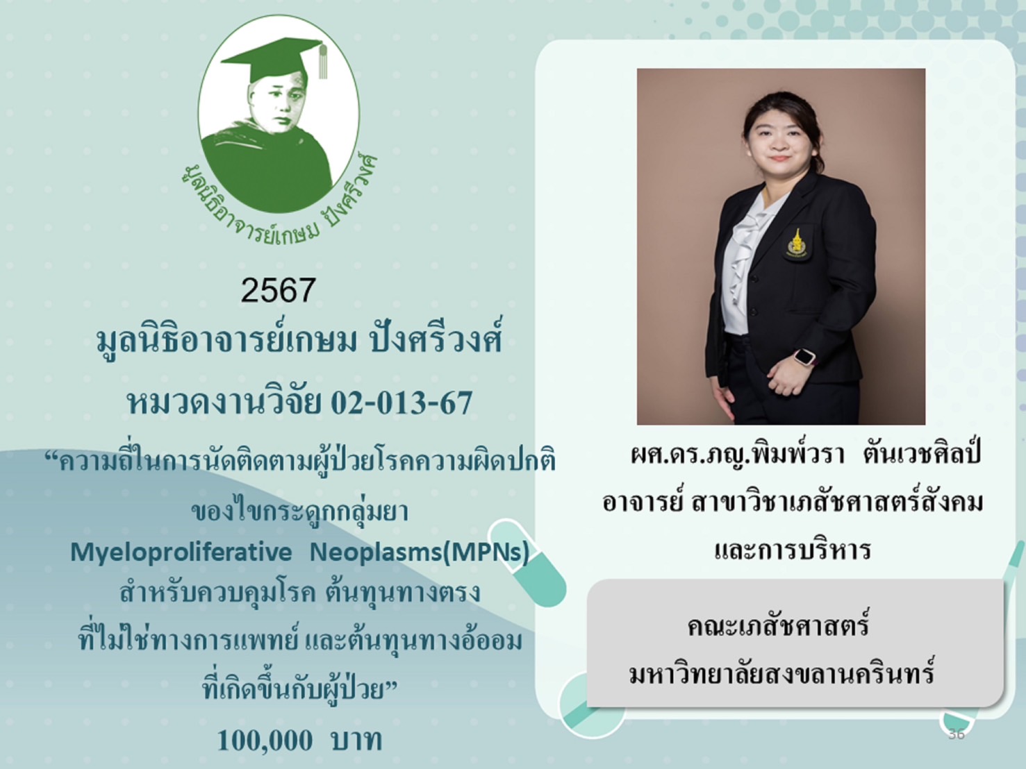 2.9 โครงการงานวิจัย “ความถี่ในการนัดติดตามผู้ป่วยโรคความผิดปกติของไขกระดูกกลุ่มยา Myeloproliferative Neoplasms (MPNs) ที่เหมาะสม สำหรับควบคุมโรค, ต้นทุนทางตรงที่ไม่ใช่ทางการแพทย์ และต้นทุนทางอ้อมที่เกิดขึ้นกับผู้ป่วย” มอบให้ ผศ.ดร.ภญ.พิมพ์วรา ตันเวชศิลป์ คณะเภสัชศาสตร์ มหาวิทยาลัยสงขลานครินทร์ เป็นเงิน 100,000 บาท