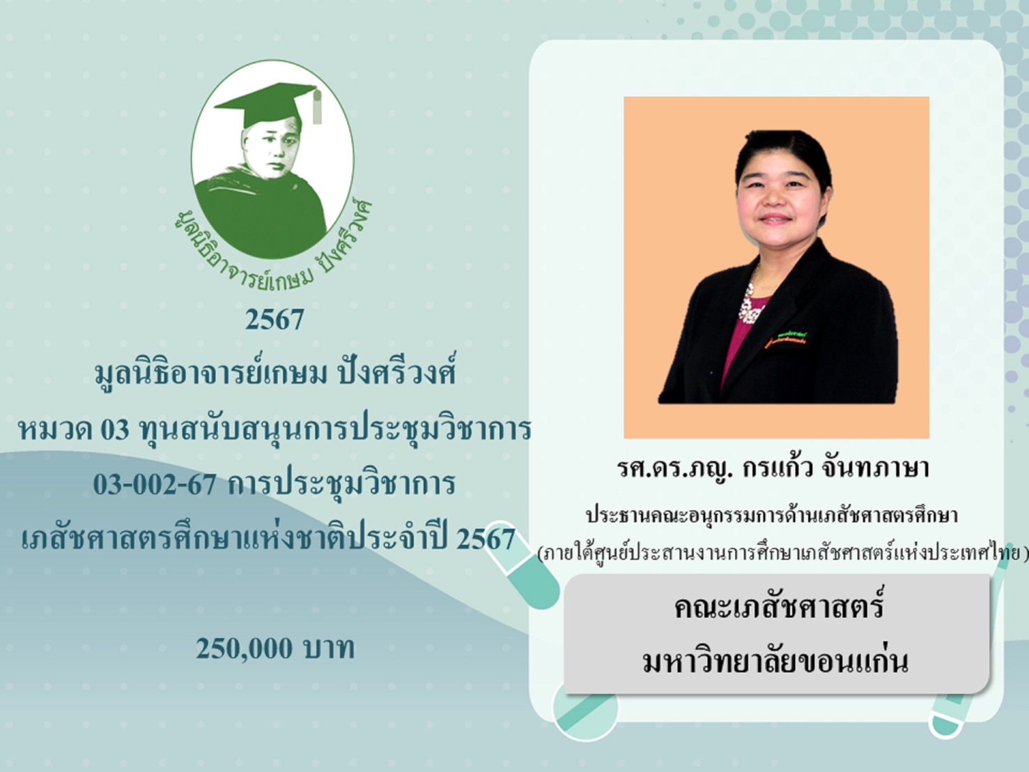 3.2 โครงการ “เภสัชศาสตร์ศึกษาแห่งชาติ ประจำปี 2567” มอบให้ ศูนย์ประสานงานการศึกษาเภสัชศาสตร์แห่งประเทศไทย รศ.ดร.ภญ.กรแก้ว จันทภาษา คณะเภสัชศาสตร์ มหาวิทยาลัยขอนแก่น เป็นเงิน 250,000 บาท